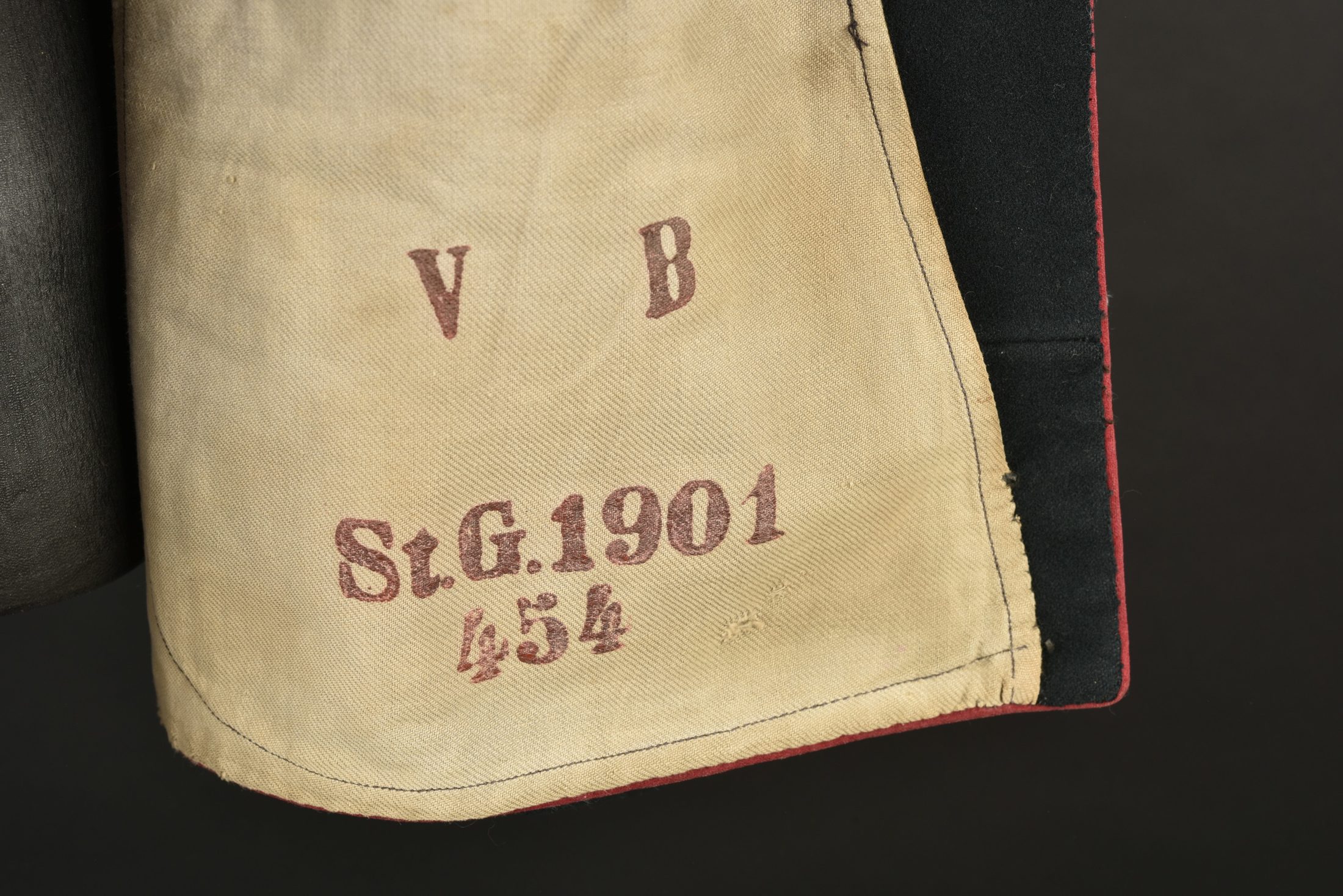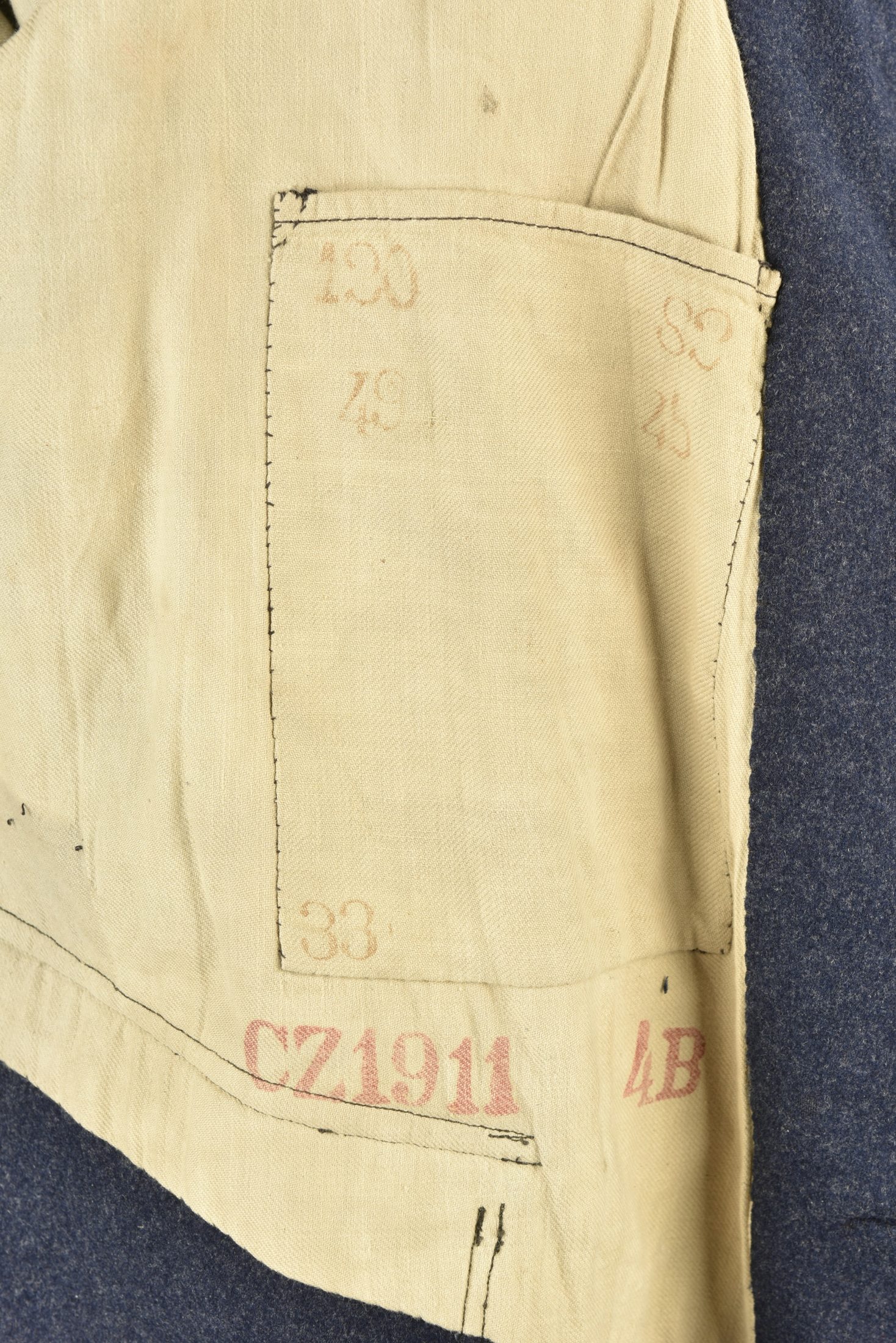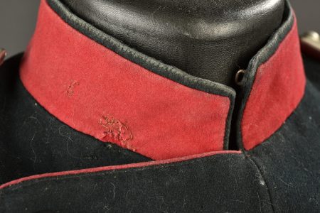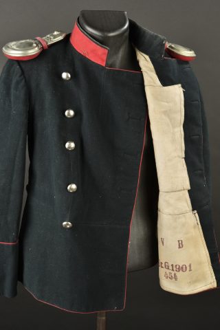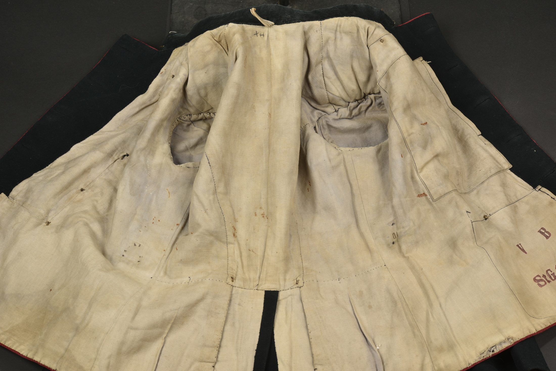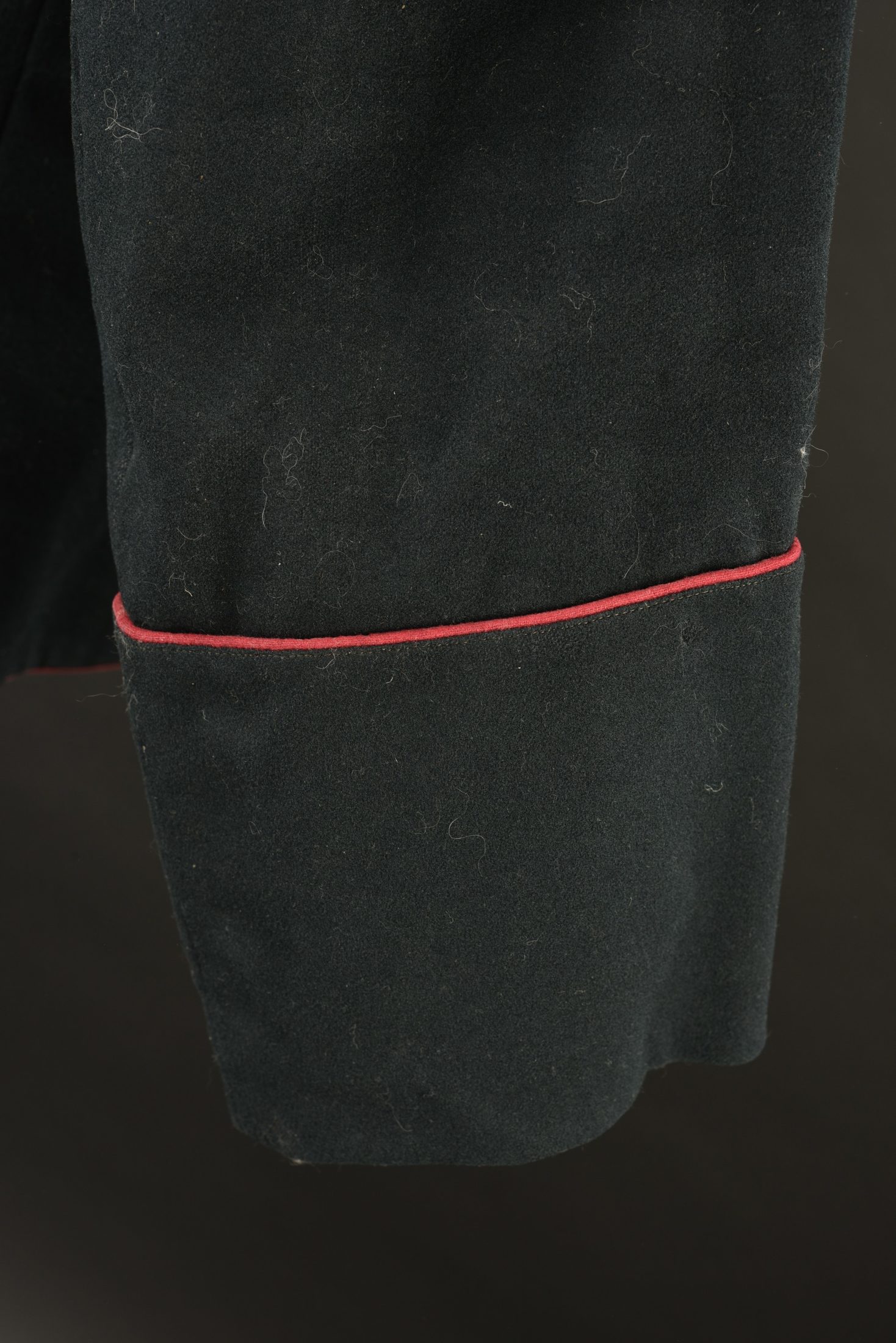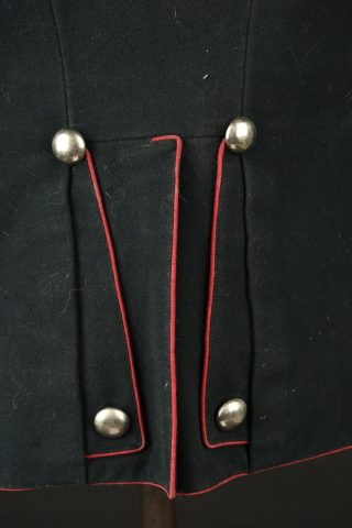 Ensemble d’effets suisses. Comprenant un pantalon droit en laine passepoilé rouge. Une tunique à deux rangées de 5 boutons en laine bleue nuit passepoilée rouge et confectionnée à Bern... en savoir plus