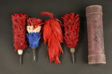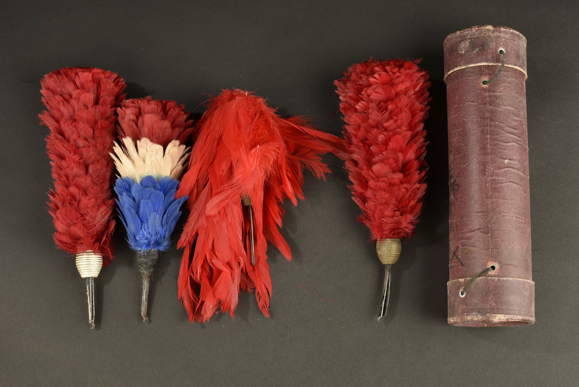 Ensemble de plumets. Un plumet tricolore. Un plumet droit rouge avec olive argentée. Un plumet retombant en plumes de coq rouges. Un plumet droit en plume rouge. Etat II+. Photos supplémentaires... en savoir plus