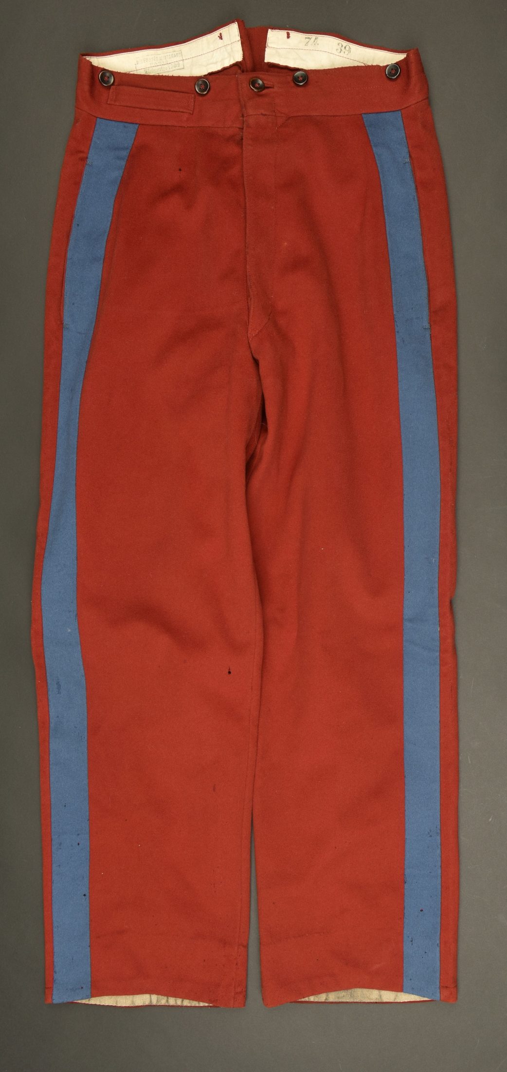Uniforme Saint Cyr. Comprenant une tunique en drap noir, pattes de col brodées cannetille, épaulettes rouges tamponnées de la 3ème compagnie et matriculé 7162. Boutons Ecole Spéciale Militaire, passant de ceinturon présent mais décousu. Un pantalon en drap garance à bandes bleu ciel, daté du 2ème trimestre 1902, divers tampons de taille et de matricule, doublure en coton écru. Un ceinturon modèle 1931 de grande tenue avec son attache porte sabre. A noter quelques trous et marques d’usures sur l’ensemble des pièces. Etat II+. Photos supplémentaires sur www.aiolfi.com. Additional photos on www.aiolfi.com.