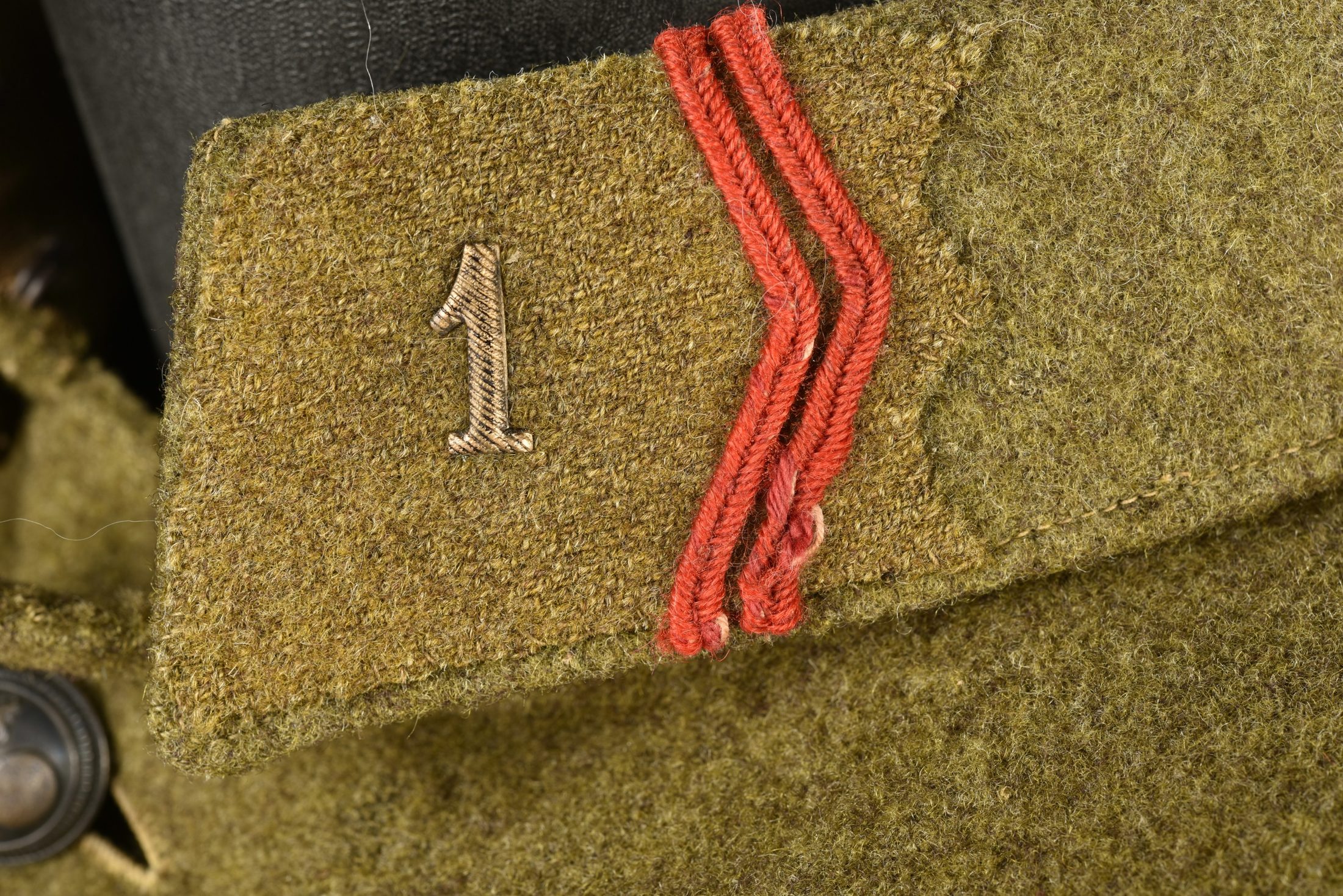 Vareuse en drap d’un adjudant du 1er zouaves. Confectionnée en drap kaki clair typique des années 1920, boutons ornés de la grenade, sur la manche gauche sont cousus trois chevrons de présence au front. Pattes de col en drap moutarde, passepoil écarlate avec chiffre 1 métallique rapporté. Très bon état. Etat I-. Photos supplémentaires sur www.aiolfi.com. Additional photos on www.aiolfi.com.