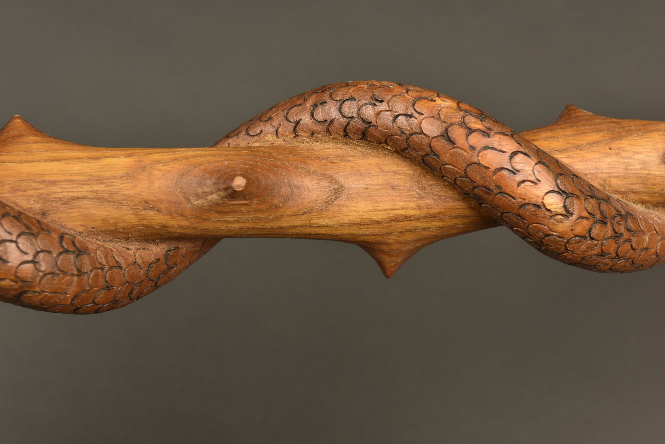 Canne sculptée 1916. En bois sculpté d’un serpent grimpant, petite plaque en laiton possédant la mention Liette 1916 Argonne. Longueur 96cm. Etat II+. Photos supplémentaires sur www.aiolfi.com. Additional photos on www.aiolfi.com.