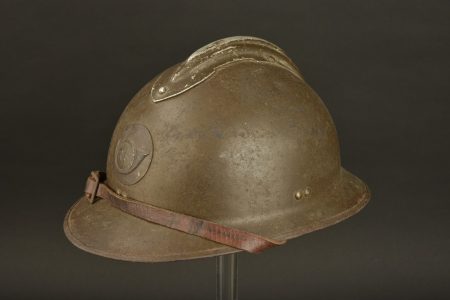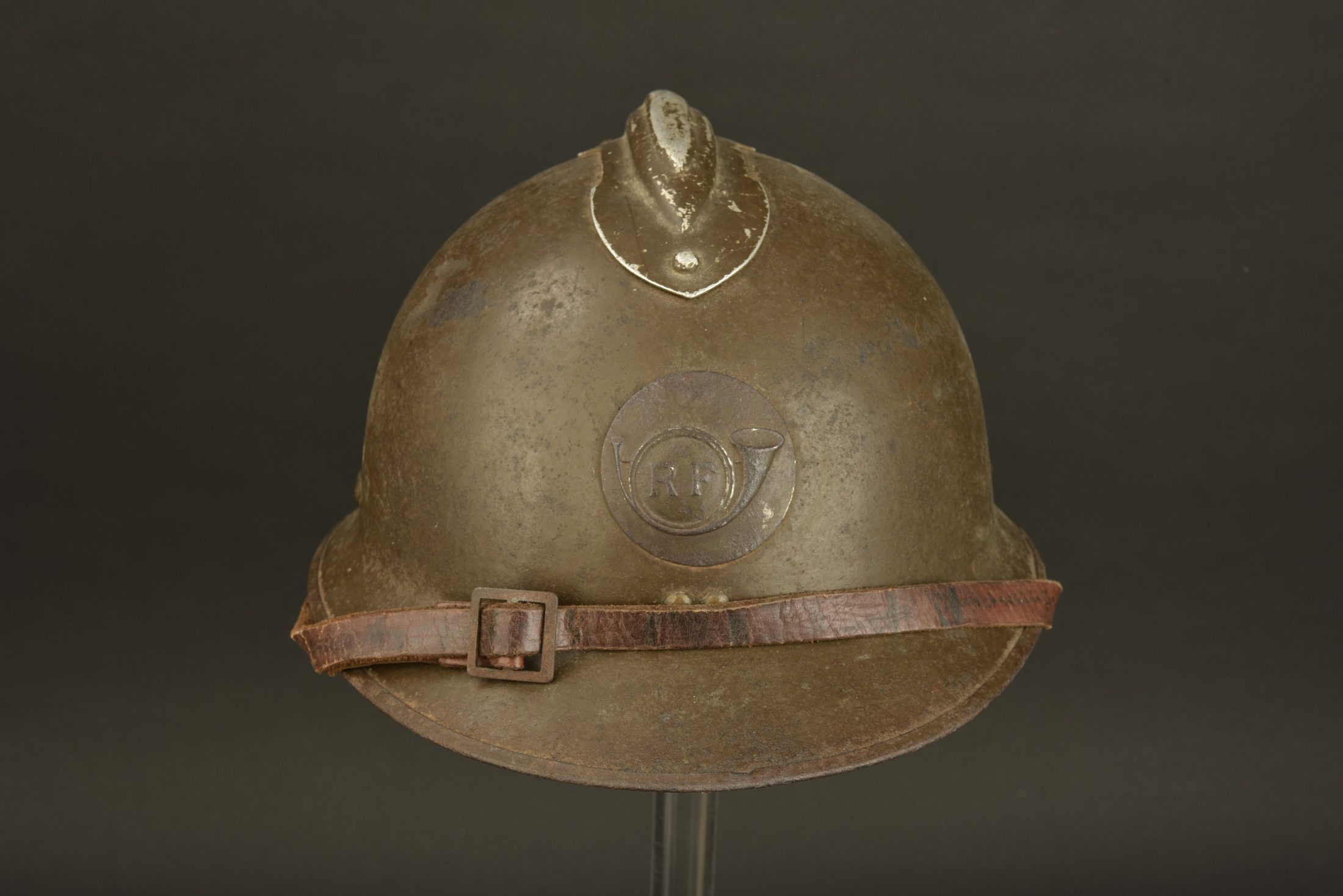 Casque Adrian 1926 chasseurs. Modèle 1926 avec attribut modèle 1937 des chasseurs, peinture verte extérieure à 85%. Coiffe intérieure en cuir noir possédant 8 agrafes dont une accidentée,... en savoir plus