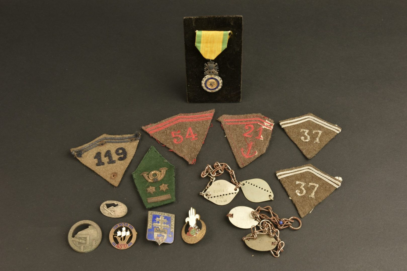 Insignes français. Une médaille valeur et discipline, ruban complet. Une paire de coins de col, chiffre 37 en cannetille argent. Un coin de col en drap, chiffre 119, trous sur l’ensemble... en savoir plus