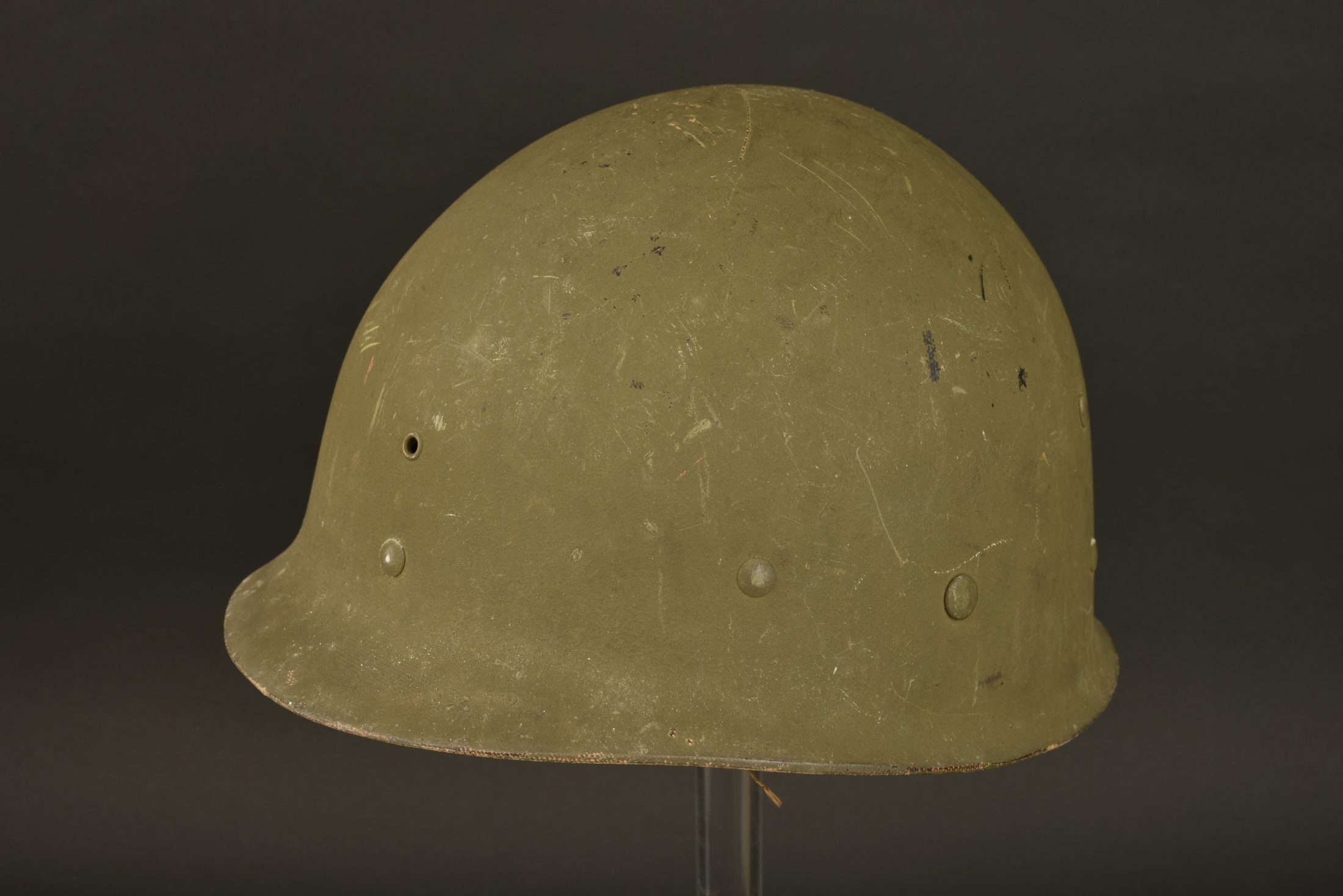 Casque USM1. Coque de casque USM1. Fermeture du jonc à l’avant. Numéro de lot illisible. Pontets fixes. Jugulaires présentes et montées d’origine. Rare système de fermeture tardif T1 équipant un casque retrouvé sur le terrain. Laundry number S-1063, sur la coque, la jugulaire et gravée sur la bordure de la coque. Nombreuses bosses sur la haut de la coque. Peinture et cork à 70%. Liner en matériaux composite haute pression, fabrication Capac. Coiffe complète, jugulaire en cuir complète. Peinture kaki à 90%. A noter une certaine usure et patine de la pièce. Collection Thierry Juif Rosebud. Etat II+. Photos supplémentaires sur www.aiolfi.com. Additional photos on www.aiolfi.com.