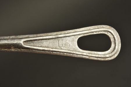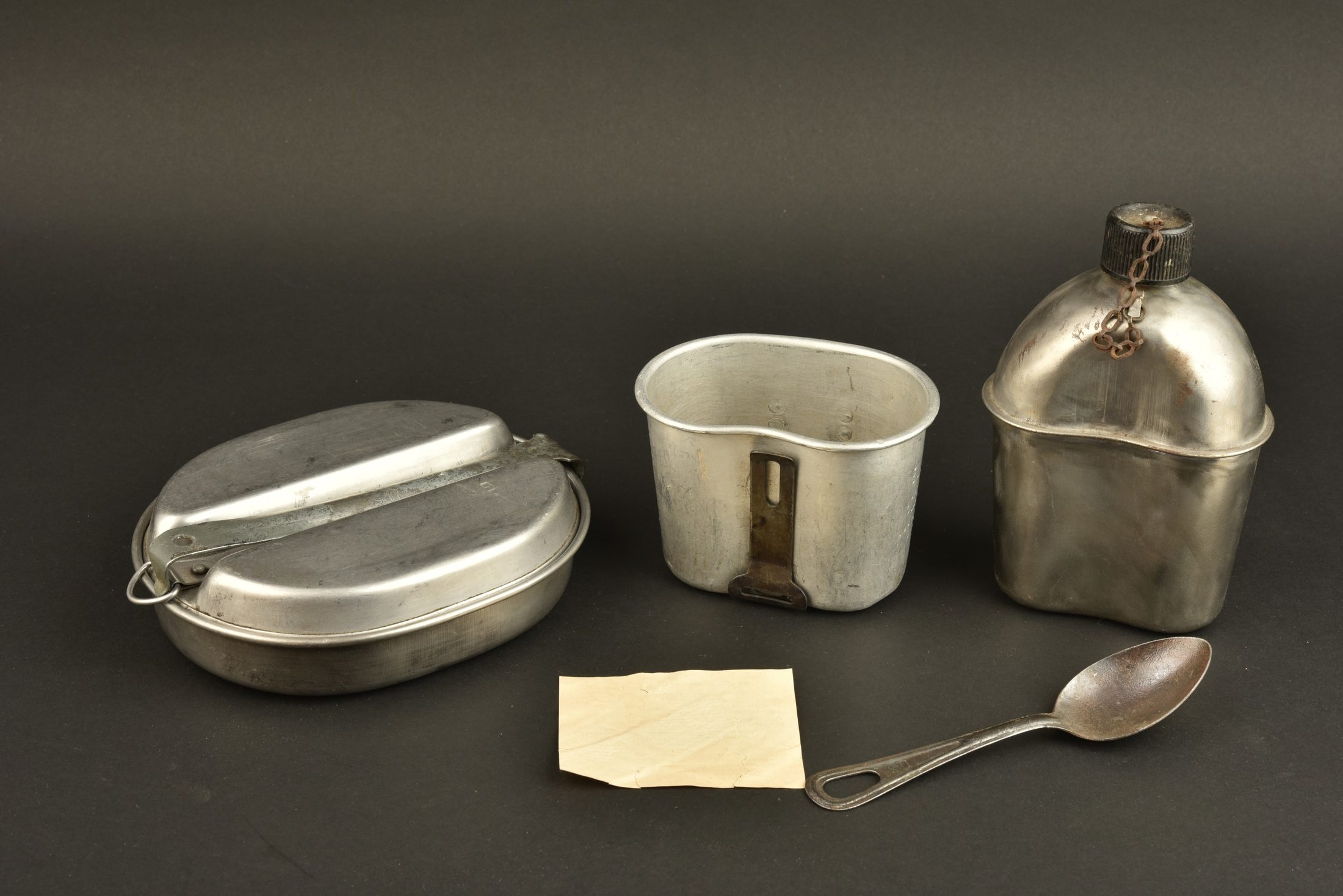 Accessoires de mess US. Comprenant une gamelle, datée 1943. Une cuillère de fouille, bien marquée US. Une gourde en métal, fortement bosselée, bouchon et chaînette présents, datée 1944. Un... en savoir plus