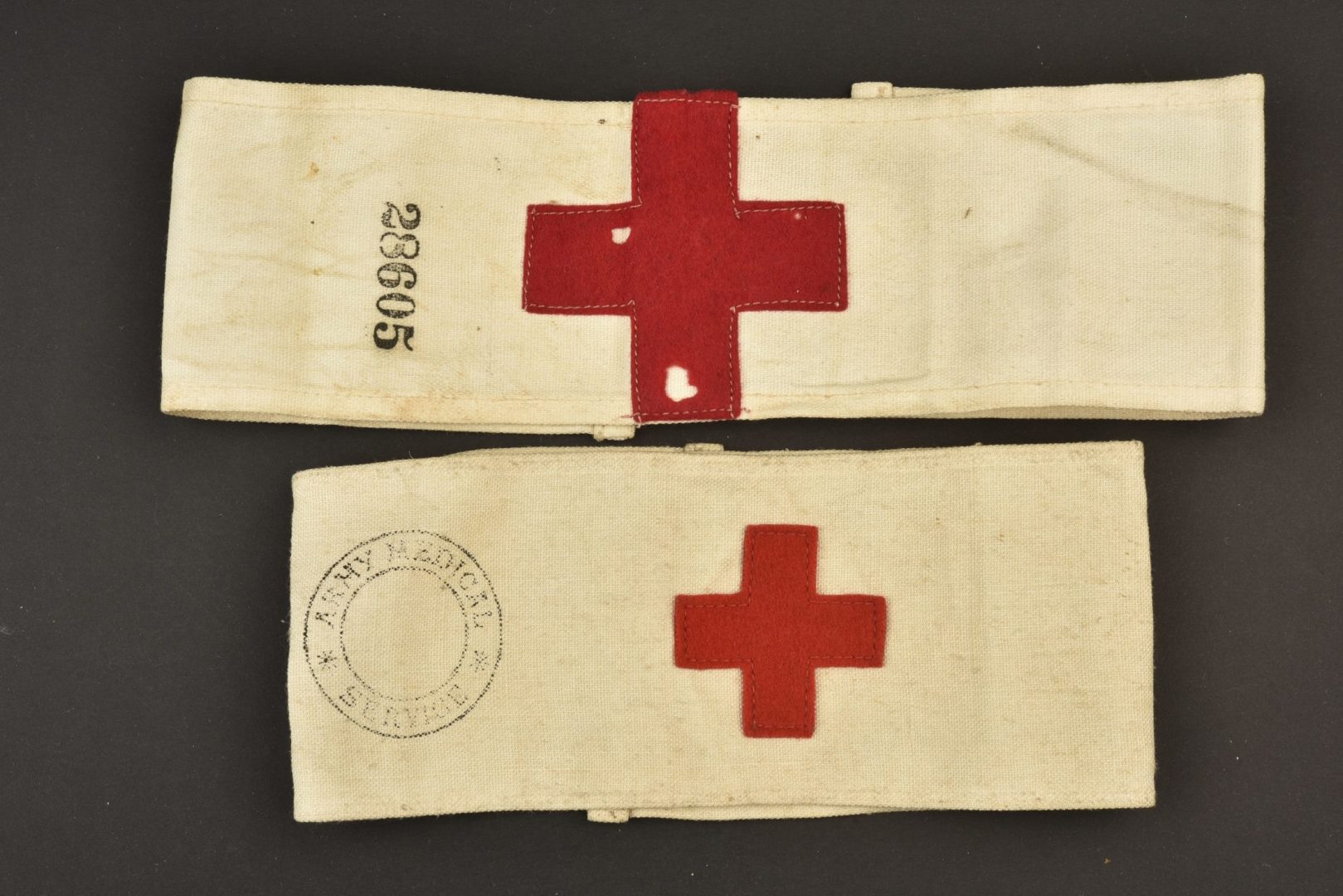 Brassards Croix Rouge. Comprenant un brassard en tissu coton blanc, croix rouge rapportée, en feutrine. Marquages 28605. Quelques trous de mite au niveau de la croix rouge. Un brassard en tissu... en savoir plus