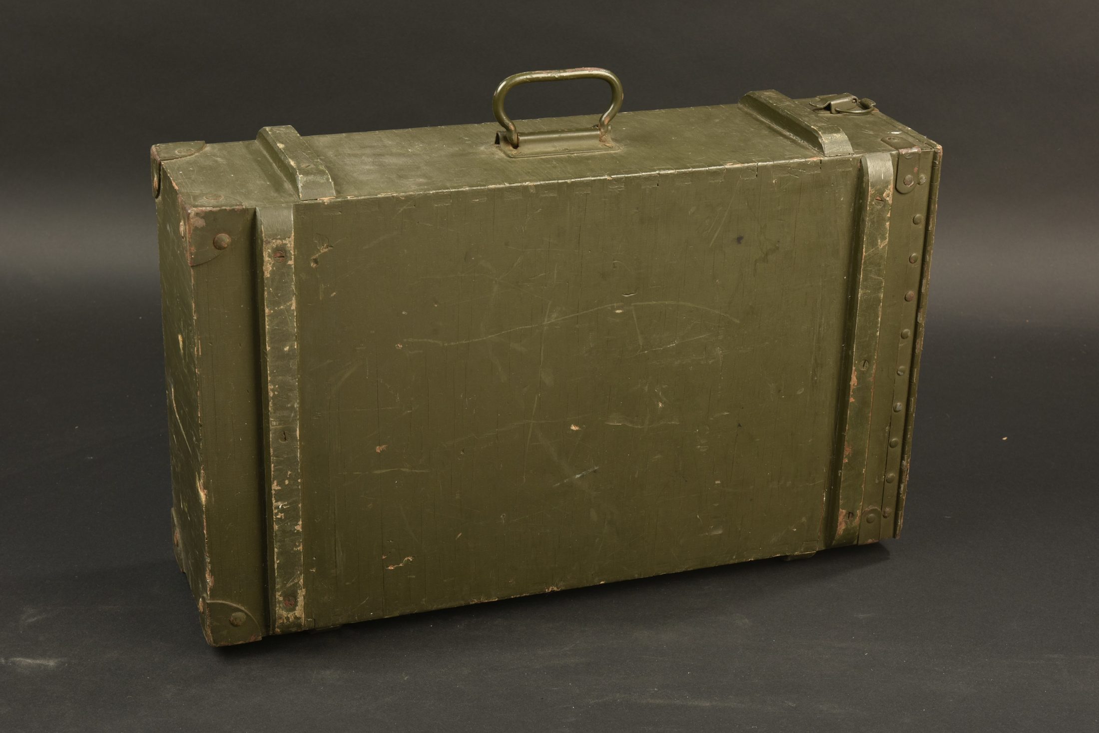 Caisse Signa Corps CH-233. Caisse en bois avec renforts en métal. Peinture kaki à 70%. Les crochets de fermeture sont complets. Marquages sur le couvercle CH-233, tampon rouge typique du Signal... en savoir plus