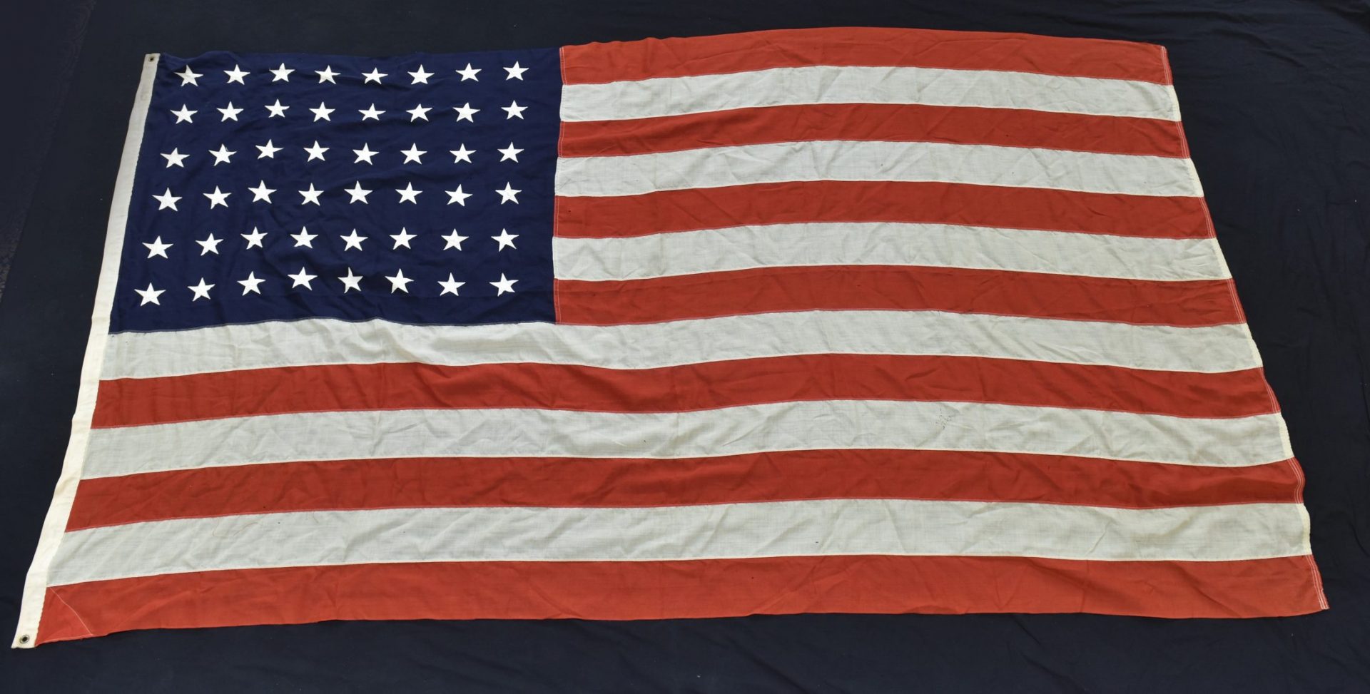 Drapeau US 48 étoiles. En tissu coton. Biface. 48 étoiles rapportées. Œillets en laiton. Marquages Washington Wool Flag, taille 6 x 10 ft, correspondant à une taille française, 183 x 305 cm.... en savoir plus