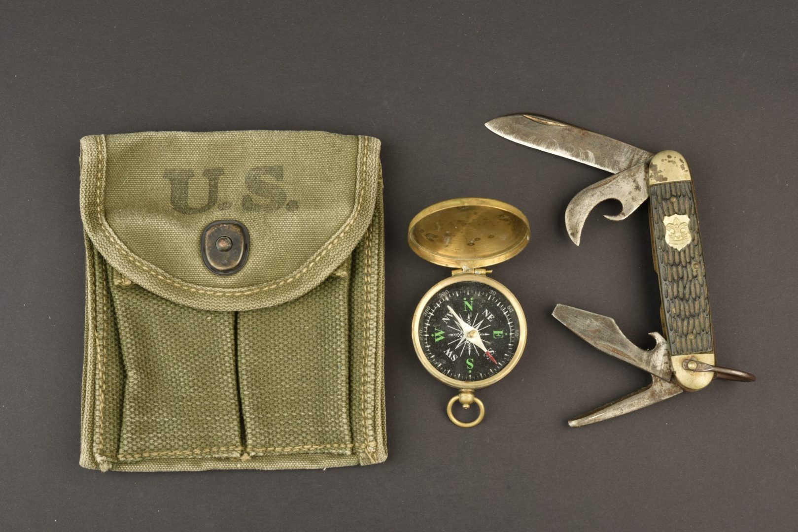 Ensemble d’équipement US. Comprenant une pochette pour chargeur de carabine USM1, bouton pression fonctionnel, beau marquage US sur le rabat, fabrication Airtress Midland 1943, modèle non... en savoir plus