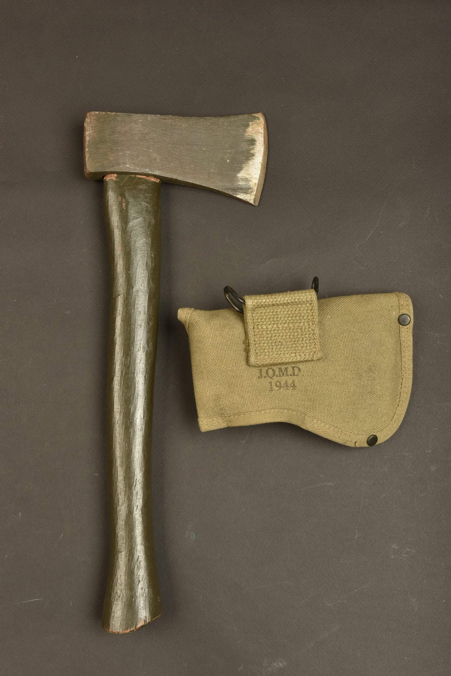 Hachette individuelle. Manche en bois, peinture kaki à 80%. Partie métallique en couleur d’origine à 40%. Sans marquages visibles. Housse en forte toile OD. Beau marquage US sur le rabat.... en savoir plus