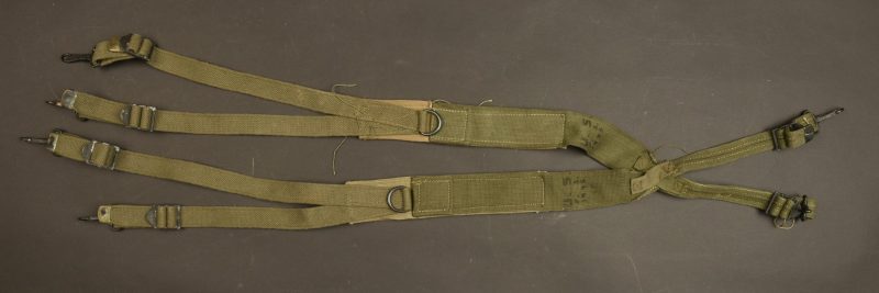 Brelage M-44 US. En forte toile OD7, quelques pièces en toile sont de couleurs différentes. Toutes les pièces en métal sont présentes, les mousquetons sont fonctionnels. Renforts d’épaule de couleur OD3. Marquages US PS 1945. A noter une certaine usure et patine de la pièce. Etat II+. Photos supplémentaires sur www.aiolfi.com. Additional photos on www.aiolfi.com.