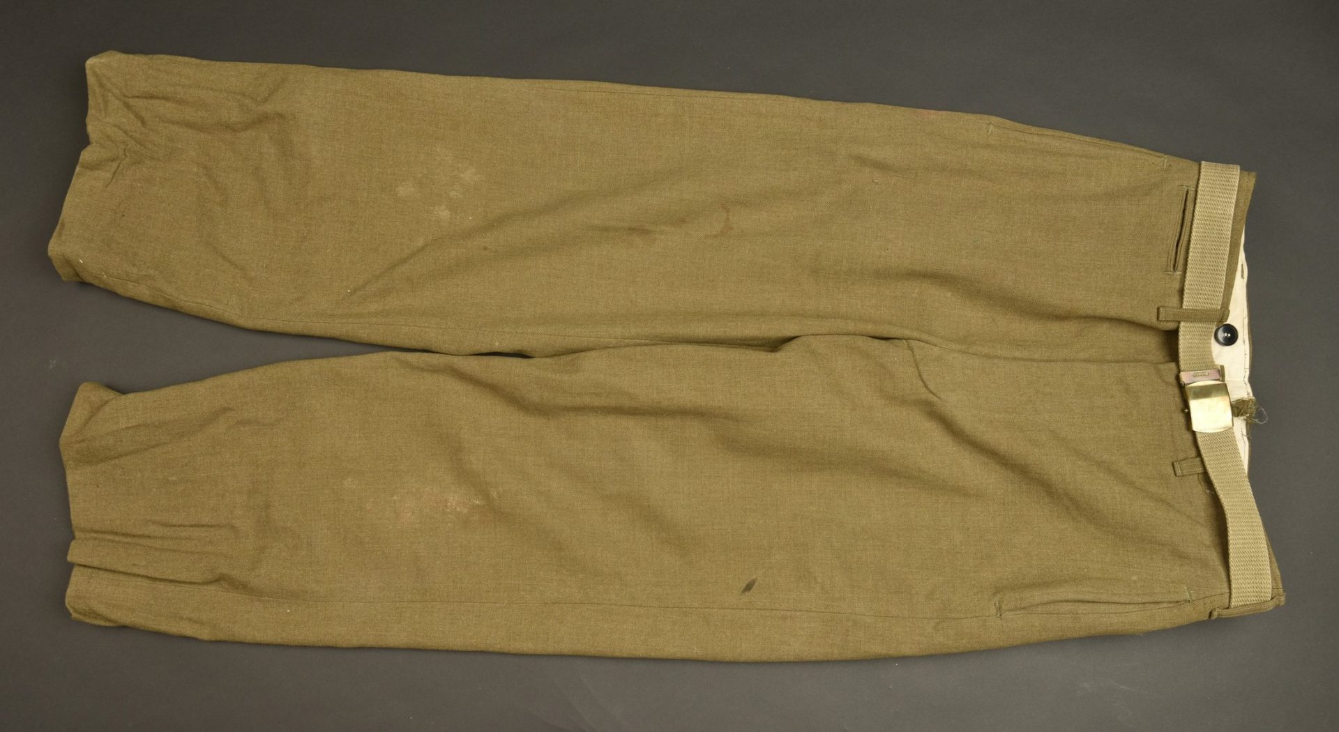 Pantalon moutarde. En drap dit moutarde. Tous les boutons sont présents. Modèle ne disposant pas de bavette anti-gaz. Intérieur doublé en tissu coton blanc. Certaines coutures sont défaites.... en savoir plus