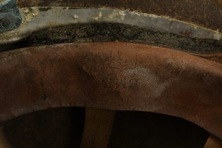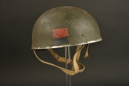 Casque de parachutiste à insigne. Coque de casque en métal. Peinture sombre à 80%. Insigne de l’artillerie, rectangle rouge et bleu, sur le côté gauche du casque. Insigne à 80%. Cerclage en aluminium fortement oxydé, avec des manques. Jugulaires en toile web, mentonnière doublée en cuir marron. Mousse usée et craquelée. Bandeau de transpiration en cuir marron, fabrication BMB, daté 1944, taille 7 5/9. Indication nominative dans le cuir, SGT Roast. La coiffe en toile au fond de la coque présente des déchirures. Tampon en feutre et cuir fortement usé avec des manques. A noter une certaine usure, patine et oxydation de la pièce. Etat II+. Plus de photos sur WWW.AIOLFI.COM, more photos on WWW.AIOLFI.COM.