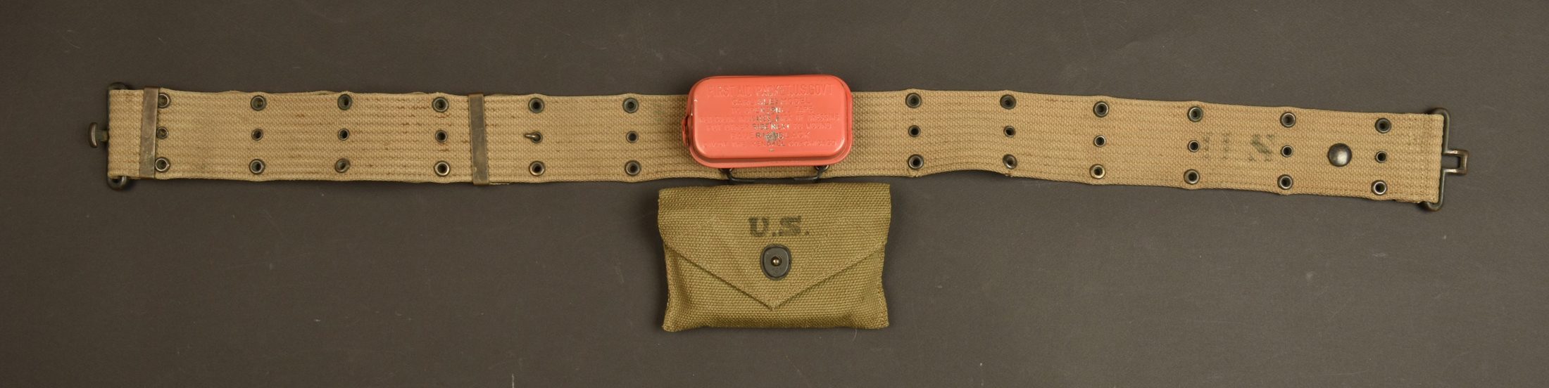 Ceinturon et accessoires US. Comprenant un ceinturon US M-36, reste de marquages US, sans marquages fabricant visibles. Bouclerie en laiton. Une pochette à pansement en toile OD, bouton pression... en savoir plus