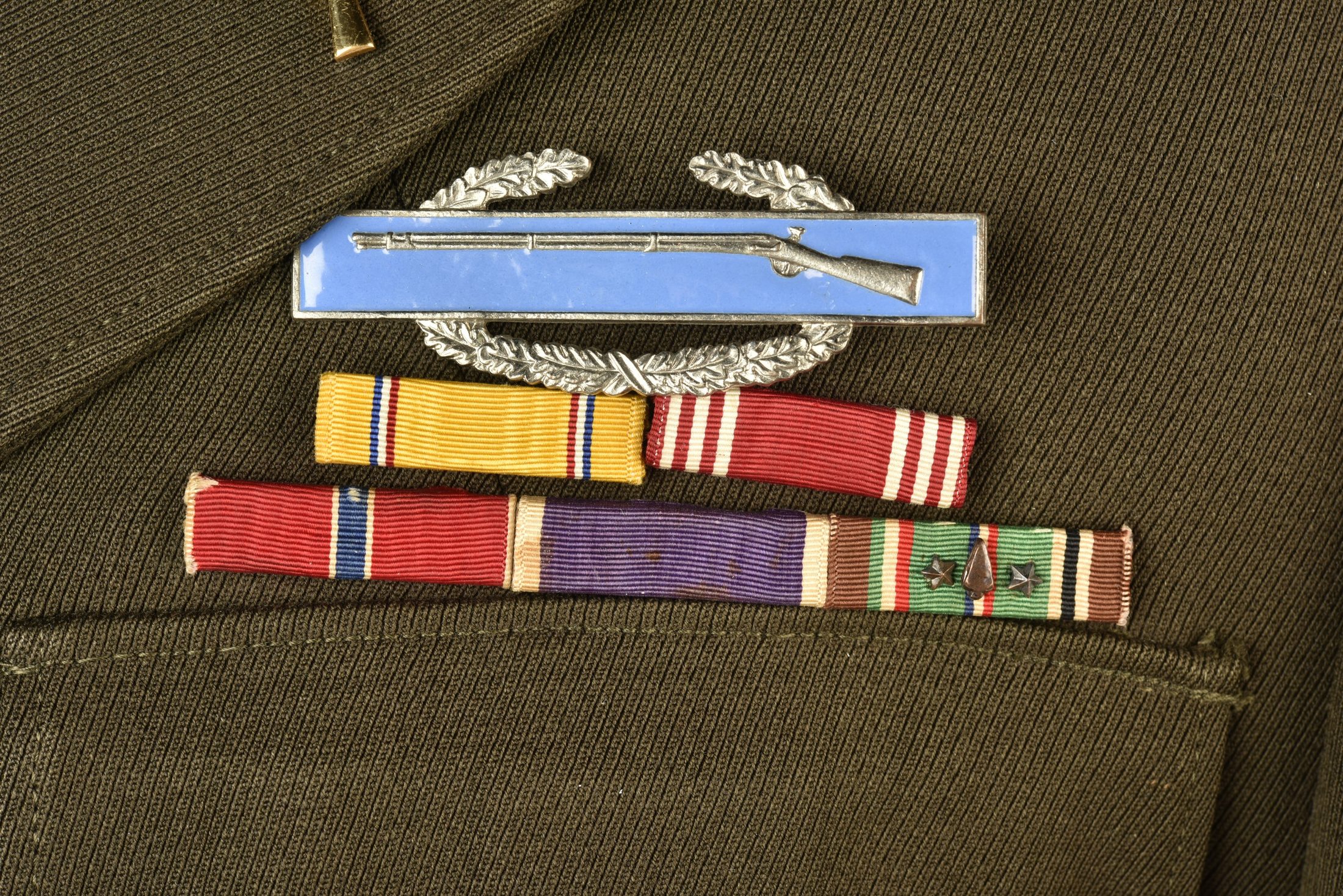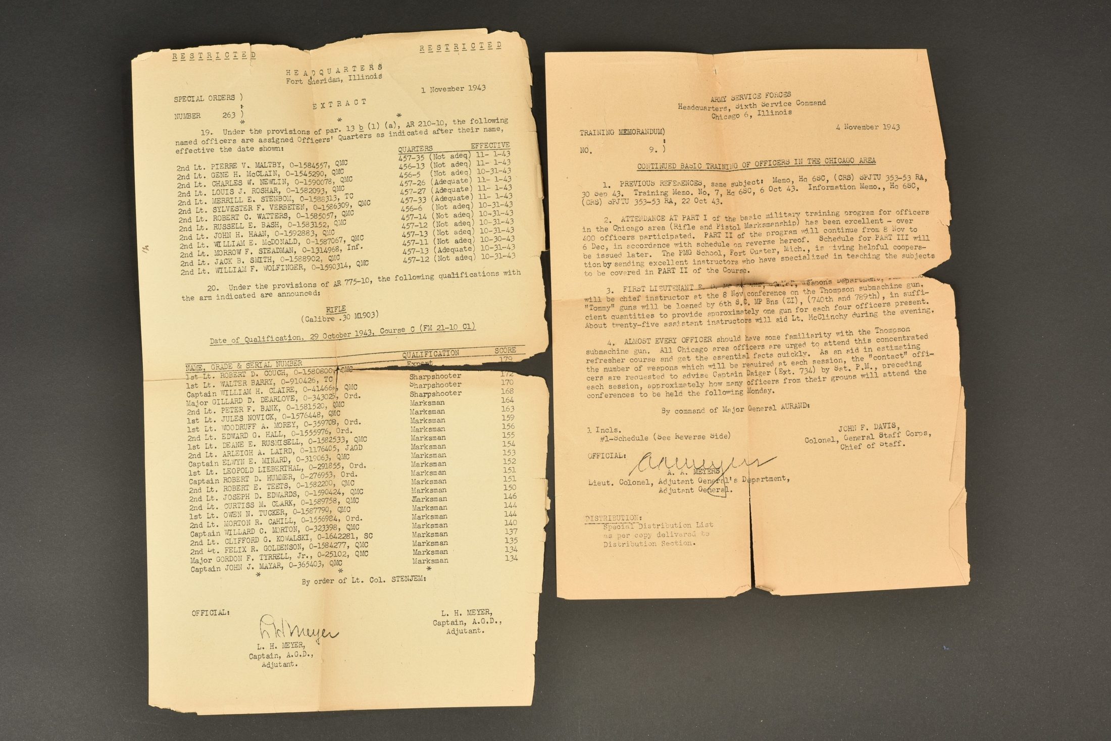 Uniforme de Major de la 7ème Armée US. Comprenant une vareuse en gabardine chocolat. Tous les boutons sont présents. Ceinture complète. Insignes de col d’infanterie US, modèles pour officiers. Grades de major au niveau des pattes d’épaule. Insigne de la 7ème armée US en cannetille or et feutrine, monté main. Barrette de cinq rubans de décoration. CIB complet, attache présente, modèle à pin’s. Intérieur doublé en satinette verte. Etiquette du tailleur Rosenfield Uniform Co Boston. Barrette de deux ans de service outre-mer. Une cravate chino, laundry number M-7956. Une chemise en tissu coton kaki, insignes de l’infanterie au niveau du col. Insigne de la 7ème armée US, monté main. Tous les boutons sont présents. Une casquette d’officier en drap kaki. Insigne d’officier en métal couleur or. Fausse jugulaire en cuir marron. Visière en cuir marron souple. Bandeau de transpiration en cuir marron, partiellement décousu. Intérieur doublé en tissu imperméabilisé orange. Reste de marquages fabricant. Taille 7. Un FM 22-5, Basic Field Manual Infantry Drill Regulation, daté du 4 août 1941, indication nominative Major Anthony J Peppe O-923215 Army Of the United States. Un FM 23-5, Basic Field Manual US Rifle Caliber 30 M1, daté du 30 juillet 1943. A noter une certaine usure et patine des pièces. Etat II+. Plus de photos sur WWW.AIOLFI.COM, more photos on WWW.AIOLFI.COM.
