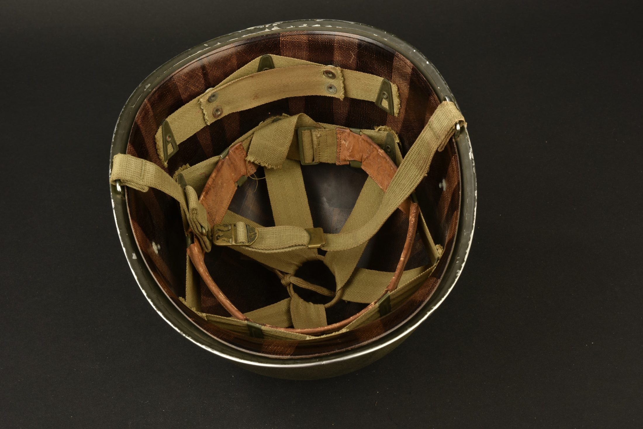 Casque USM1. Coque de casque USM1. Fermeture du jonc à l’avant. Numéro de lot illisible. Pontets fixes. Jugulaires présentes et montées d’origine. Peinture et cork à 90%. Liner en matériaux composite haute pression, fabrication MSA. Coiffe complète, jugulaire en cuir absente. Peinture kaki à 70%, reconditionnée. A noter une légère usure et patine de la pièce. Etat I-. Plus de photos sur WWW.AIOLFI.COM, more photos on WWW.AIOLFI.COM.