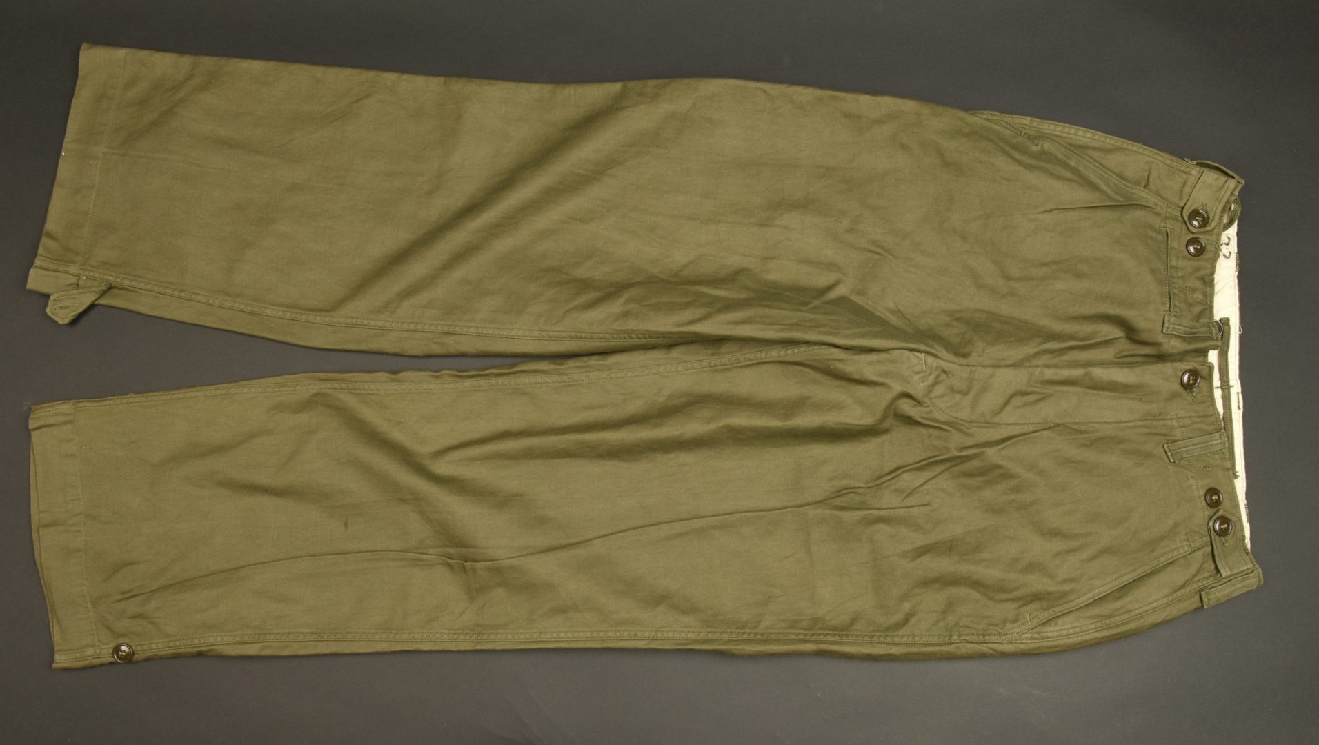 Pantalon M-43. En popeline kaki. Tous les boutons sont présents. Les pattes de serrage au bas des jambes sont présentes. Intérieur doublé en tissu coton blanc. Notice complète. Indications de... en savoir plus
