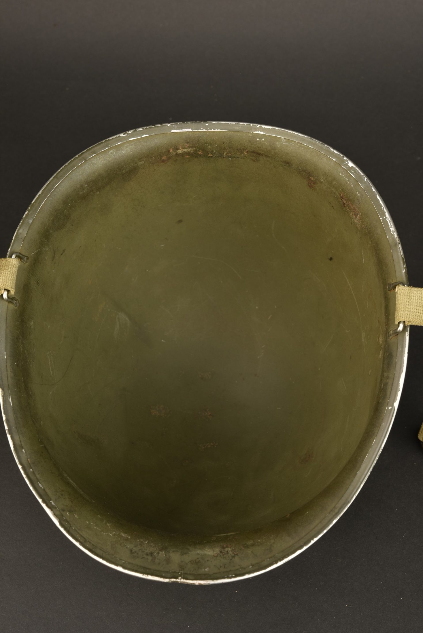 Casque USM1. Coque de casque USM1. Fermeture du jonc à l’avant. Numéro de lot 574A, correspondant à une fabrication de juin 1943. Pontets fixes. Jugulaires présentes et montées d’origine. Bouclerie en laiton. Peinture et cork à 85%. Liner en matériaux composite haute pression, fabrication MSA. Coiffe complète en parfait état. Jugulaire en cuir complète. Peinture kaki à 95%. A noter une certaine usure et patine de la pièce. Etat I-. Plus de photos sur WWW.AIOLFI.COM, more photos on WWW.AIOLFI.COM.
