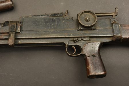 Fusil mitrailleur Bren MKI. Catégorie C9. Bronzage à 30%, nombreuses marques de peinture noire. Bâti en métal, crosse en bois incomplète. Poignée supplémentaire présente, bipied présent... en savoir plus