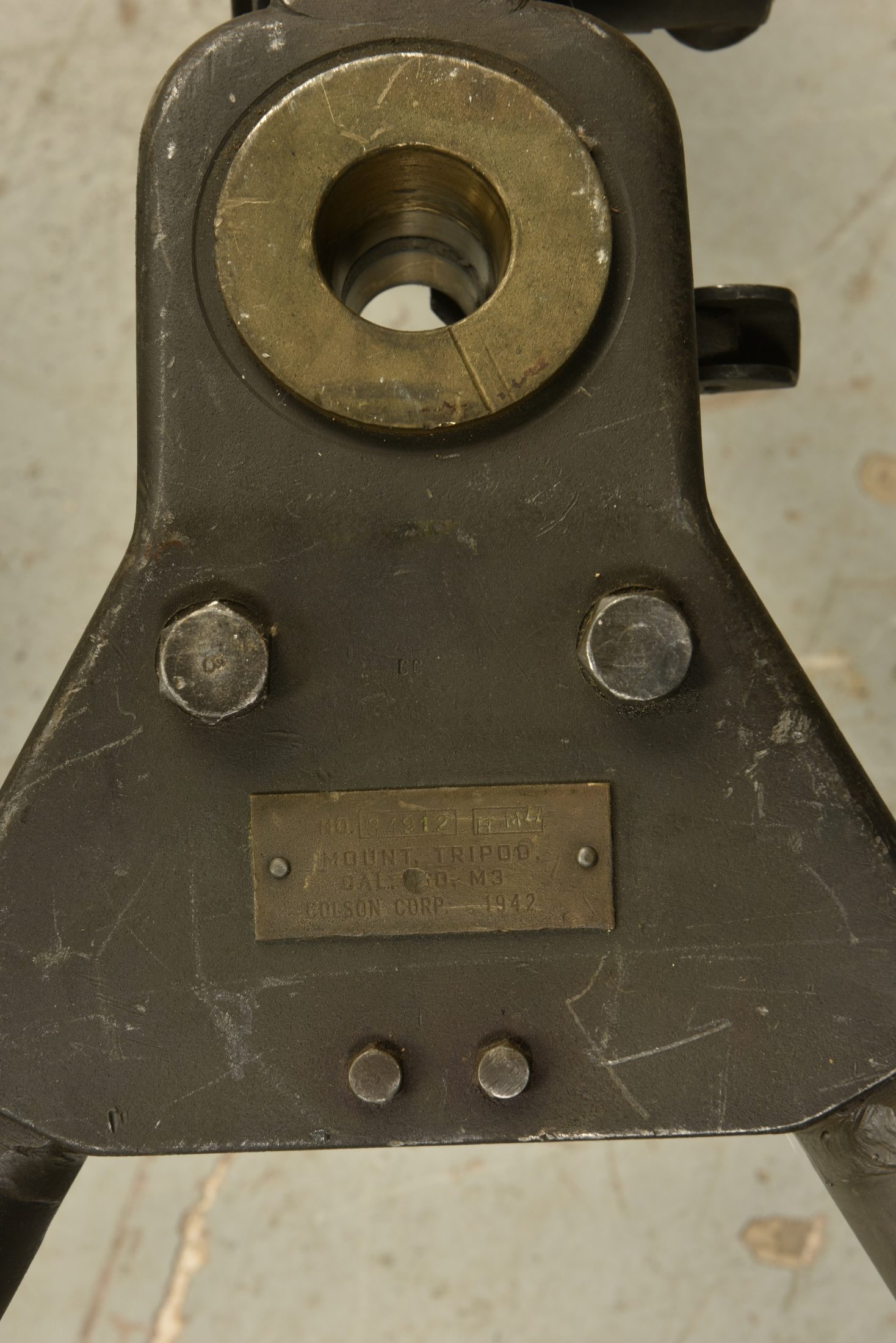 Mitrailleuse calibre 50 US Catégorie C9. Affût tripod, peinture kaki à 80%. Pied marquée B108393-2 CCBet. Plaque numéro 84912 Mount Tripod M3 Colson Corps 1942. Toutes les pièces mobiles... en savoir plus