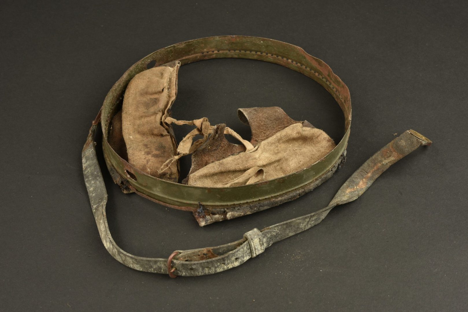Coiffe de Stahlhelm et jugulaire de casque à pointe Cerclage fer modèle 1917 avec 2 de ses panneaux de cuir, un sans les dents de loup, état moyen, sans coussinets? Une jugulaire cuir à boucle... en savoir plus