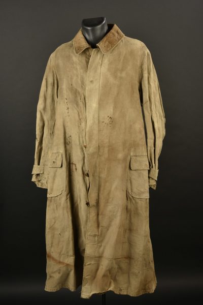 Manteau de pluie aérostier. En toile imperméabilisé beige, marquage à l’encre LB5 pour Luftsischer Bataillon 5, traces de pattes de col décousues. Nombreuses traces d’usures et réparations. Etat II-. Plus de photos sur WWW.AIOLFI.COM, more photos on WWW.AIOLFI.COM.