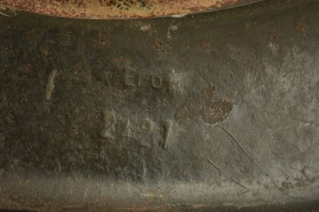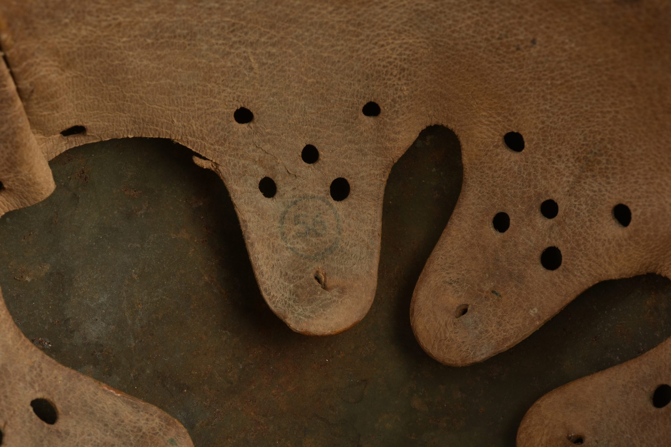 Casque camouflé allemand. Coque de casque M42. Numéro de lot 2421, code fabricant EF64. Peinture camouflée deux tons ocre et vert à 60%. Application au pinceau. Coiffe en cuir complète.... en savoir plus