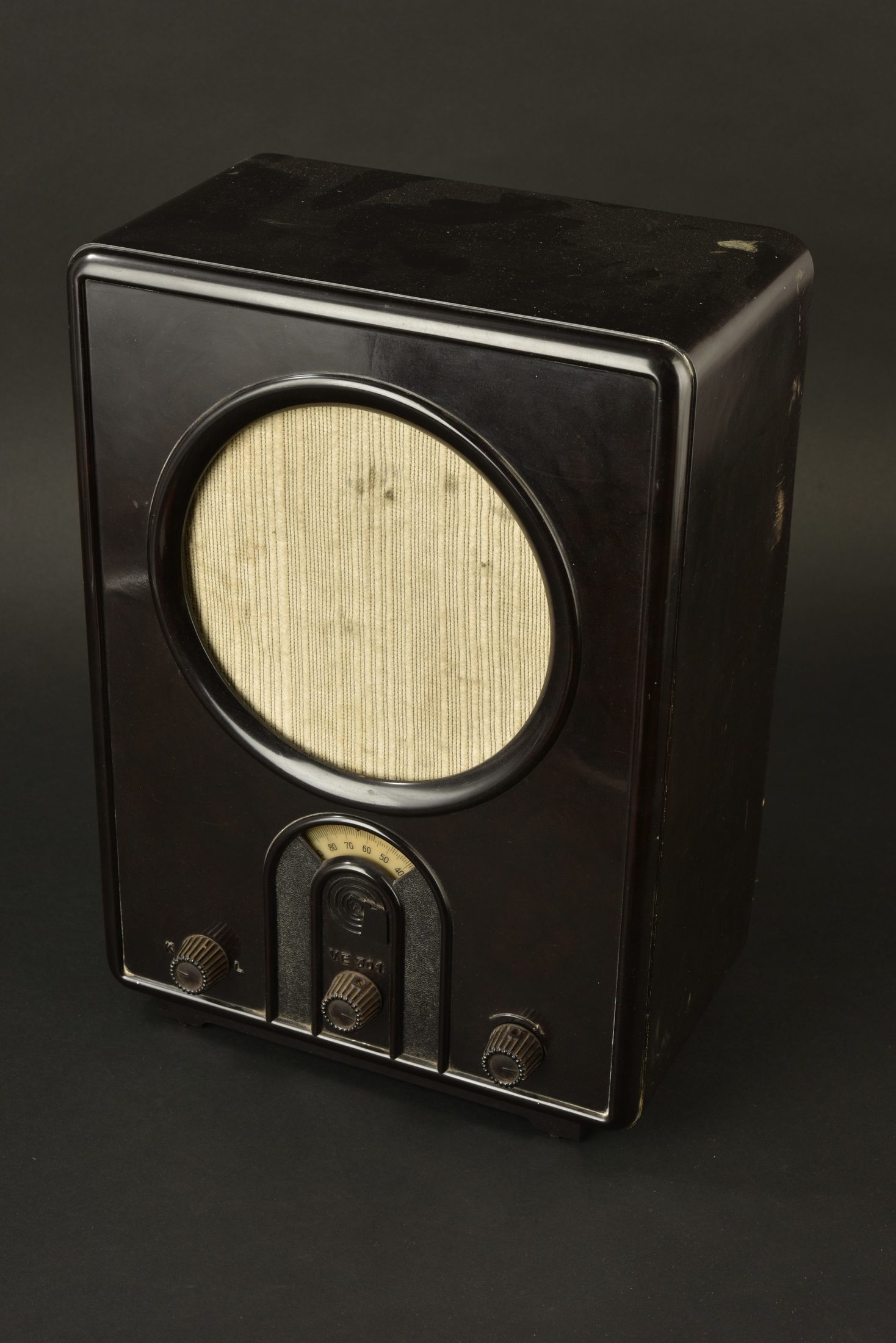 Radio allemande. Modèle en bakélite marron. Tous les boutons sont fonctionnels. Marquages VE 301. Deux vis manquantes au dos. Câble et prise présents, dénudés. Fabrication Ernst Masting Ulm.... en savoir plus