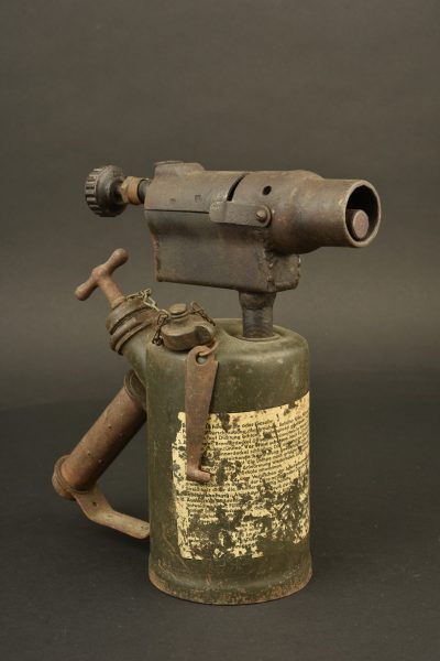 Réchauffe moteur allemand. En métal. Reste d’étiquette au niveau de la bombonne. Poignée transport. Toutes les pièces mobiles sont fonctionnelles. Certains accessoires sont présents. Plaquette fabricant illisible. A noter une certaine usure et oxydation de la pièce. Etat II+. Plus de photos sur WWW.AIOLFI.COM, more photos on WWW.AIOLFI.COM.