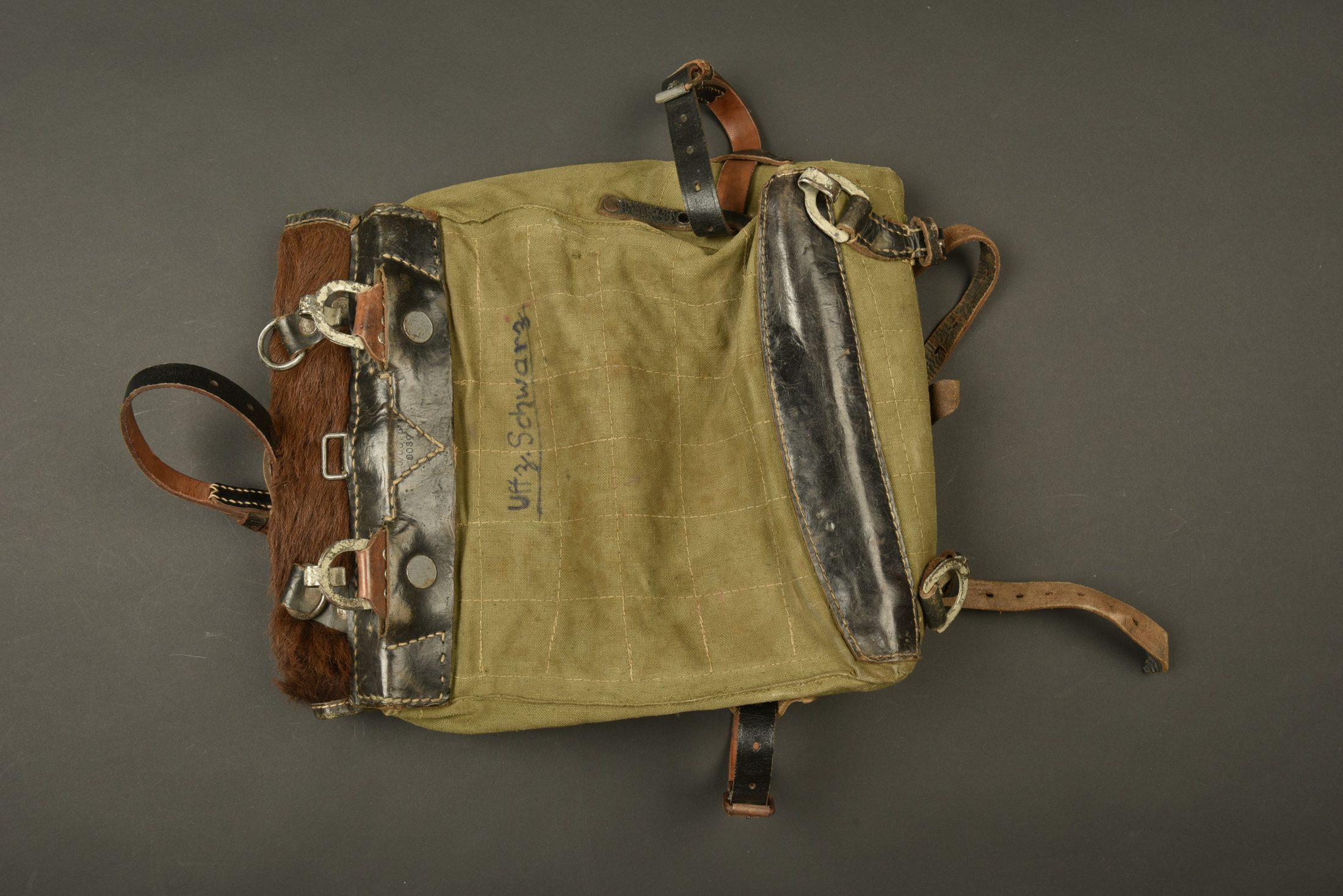 Sac à dos poils de vache. En forte toile coton Feldgrau. Poils de vache marron. Toutes les sangles sont présentes, ainsi que toutes les pièces métalliques. Les bretelles sont manquantes.... en savoir plus