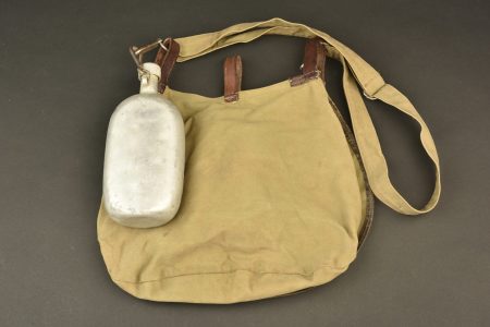 Sac à pain et gourde. Comprenant un sac à pain en toile Feldgrau et cuir marron, sans marquages visibles. Sangle de transport présente. Gourde en aluminium, complète avec son bouchon et son... en savoir plus