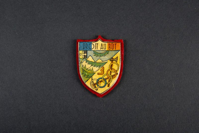 Un insigne général du groupement 3 modèle peint sur cuir reposant sur un socle en drap rouge indiquant le 2ème groupe. Le groupement 3 était stationné à Bourg dans l’Ain. Provenance collection Christian Cournol.
