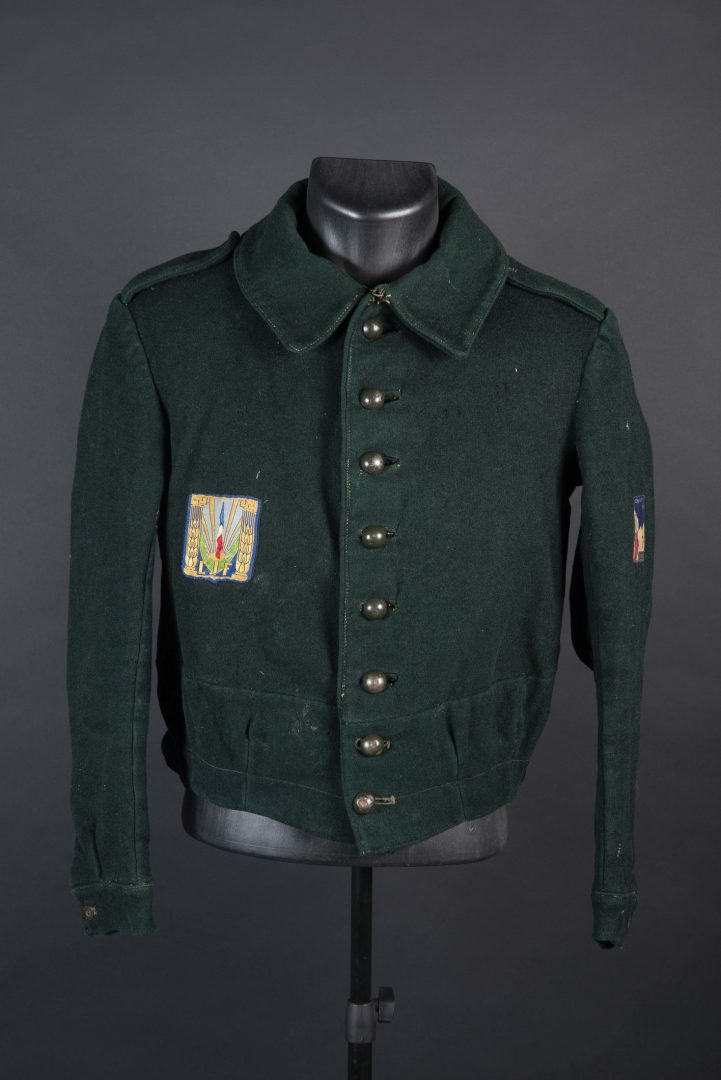 Blouson de jeune des Chantiers du Groupement 7 confectionné à partir d’une vareuse toute arme modèle 38, drap kaki teinté en vert forêt, 8 boutons demi sphériques, insigne général cousu sur la poitrine, doublure en coton écru portant le tampon du CJF 7, traces de pattes de col décousues, insigne de bras du groupement 7. Ce blouson est un effet typique des tous premiers uniformes porté par les Chantiers. Le groupement 7 était stationné à Rumilly en Haute Savoie. Provenance collection Christian Cournol.