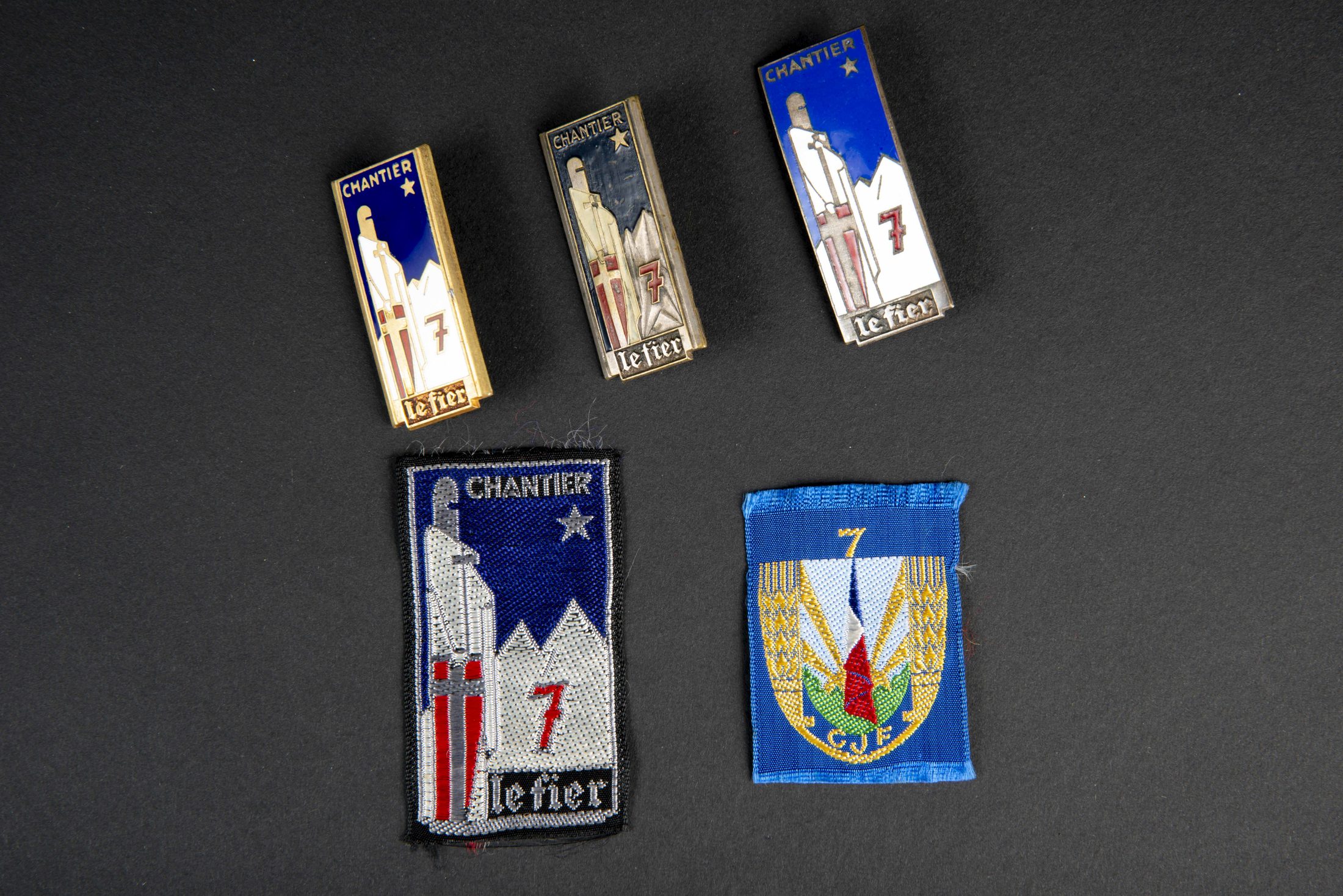 5 insignes du groupement 7 comprenant un modèle en métal doré émaillé de fabrication Drago Béranger, un en métal argenté émaillé de fabrication Drago Paris Déposé, un en métal peint fabrication Drago Béranger, un insigne en tissu et un insigne dé béret sur fond bleu. Traces d’usures. Le groupement 7 était stationné à Rumilly en Haute Savoie. Provenance collection Christian Cournol.