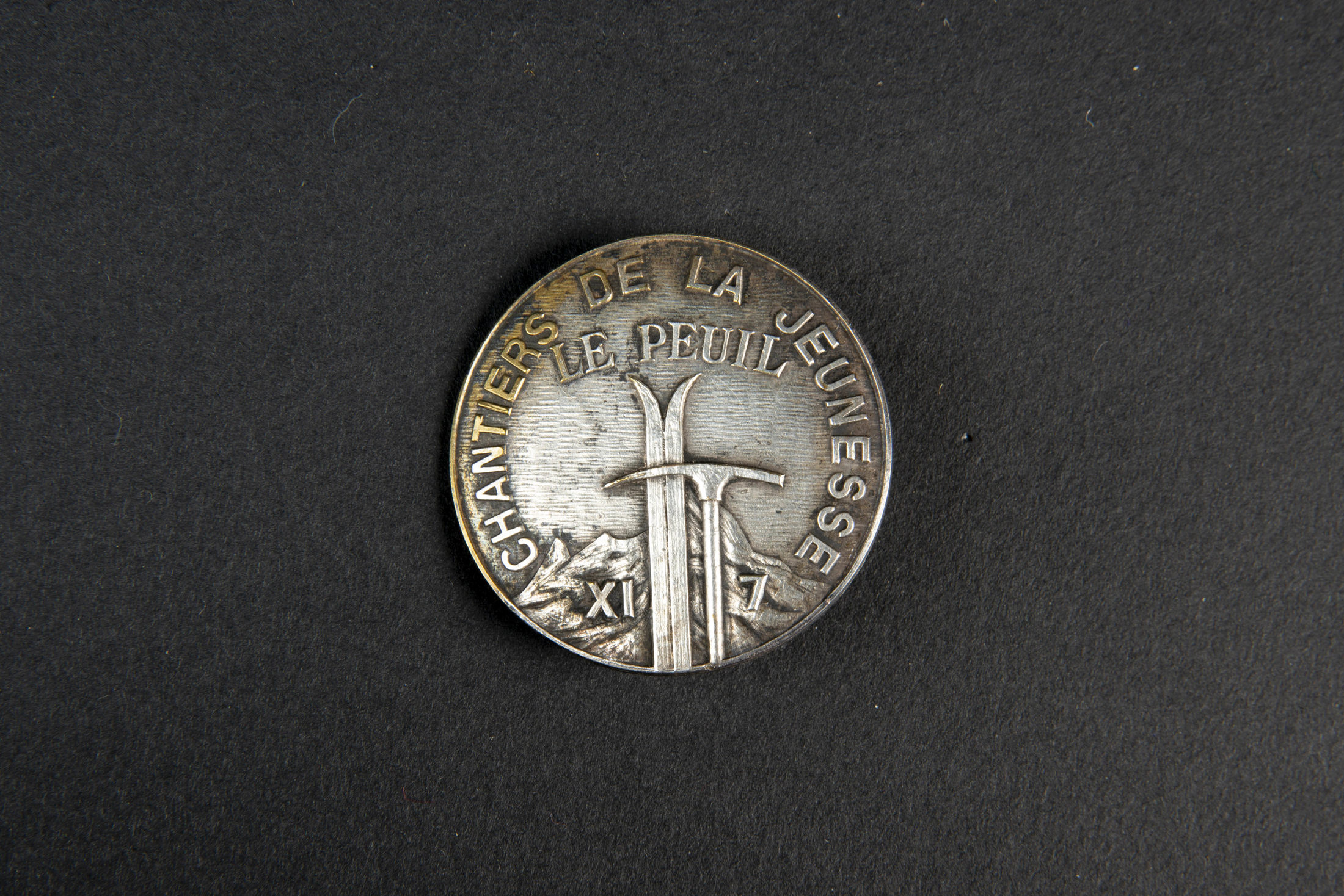 Insigne du groupement 11, groupe 7 Le Peuil, en métal embouti de fabrication Paquet à Grenoble. Le groupement 11 était stationné à Villard de Lans dans l’Isère . Provenance collection Christian Cournol.