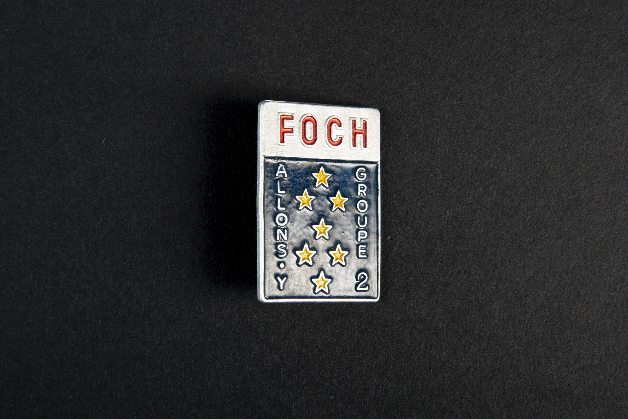 Insigne du groupe 2 dit Foch du groupement 12 en aluminium peint de fabrication Paquet à Grenoble. Le groupement 12 était stationné à Saint-Martin d’Uriage dans l’Isère, puis à Vizille et Moustey dans les Landes . Provenance collection Christian Cournol.