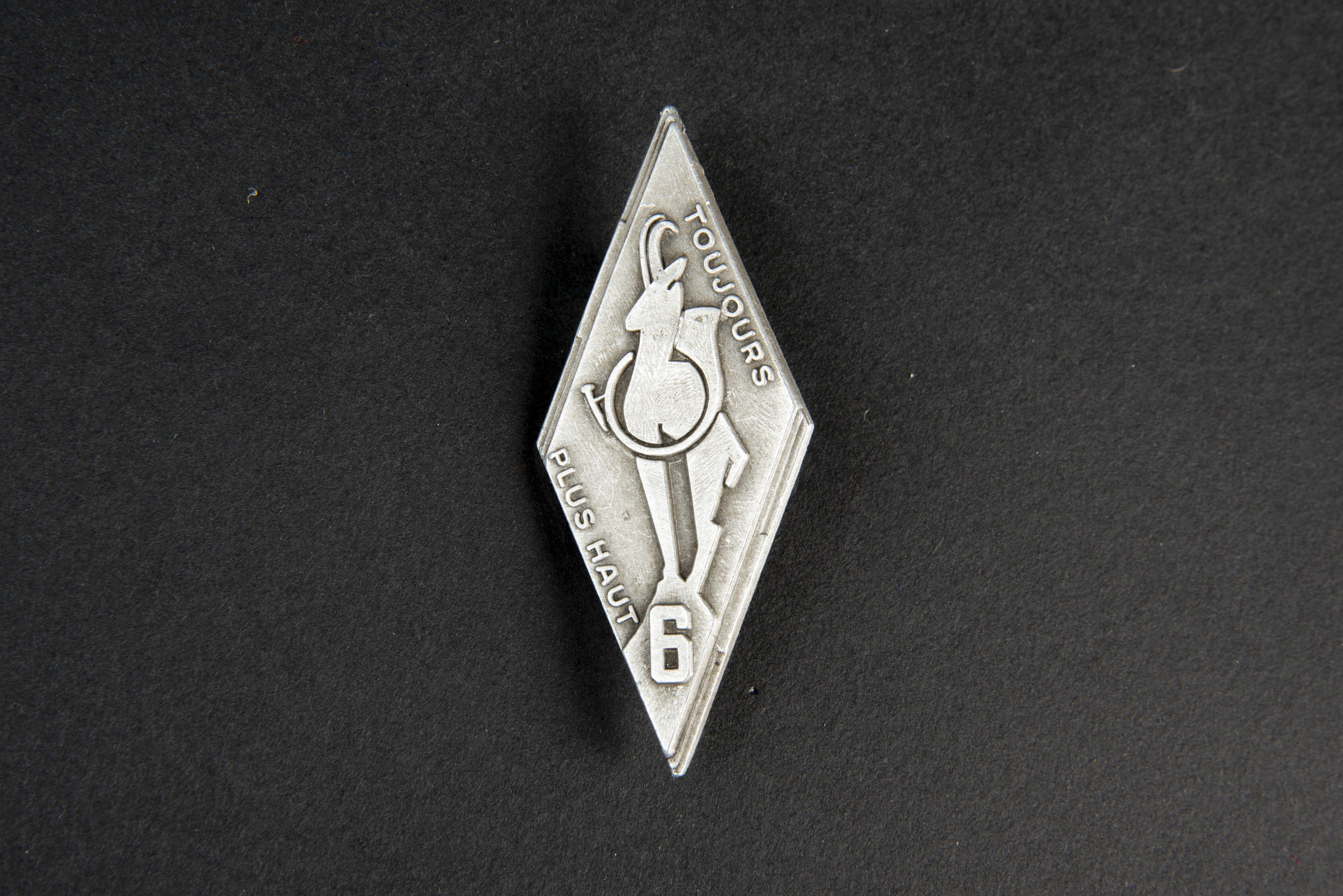 Insigne du groupe 6 du groupement 43 Sidi Brahim en aluminium de fabrication Paquet à Grenoble. Le groupement 43 était stationné à Artemare dans l’Ain puis à Toctoucau en Gironde . Provenance collection Christian Cournol.