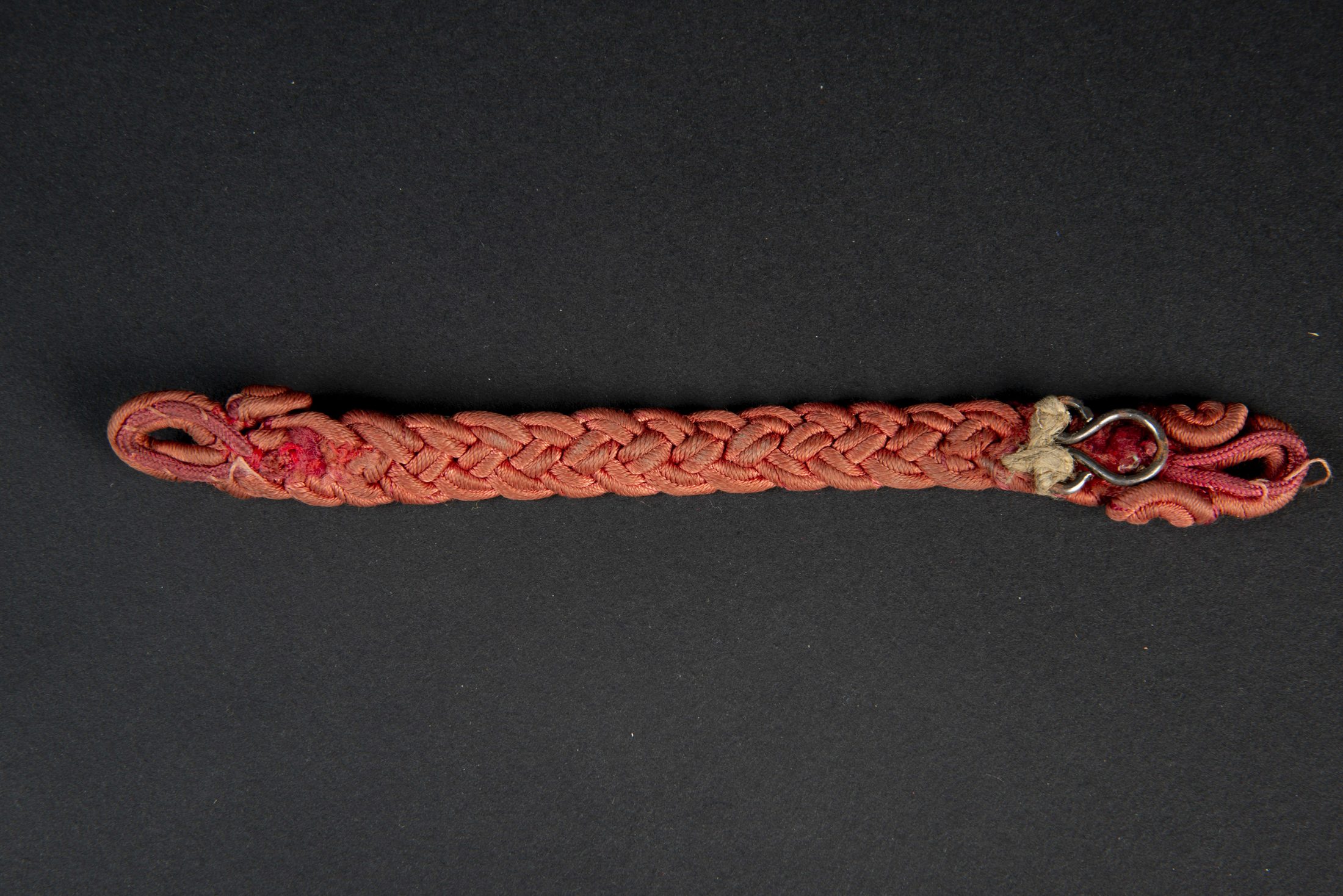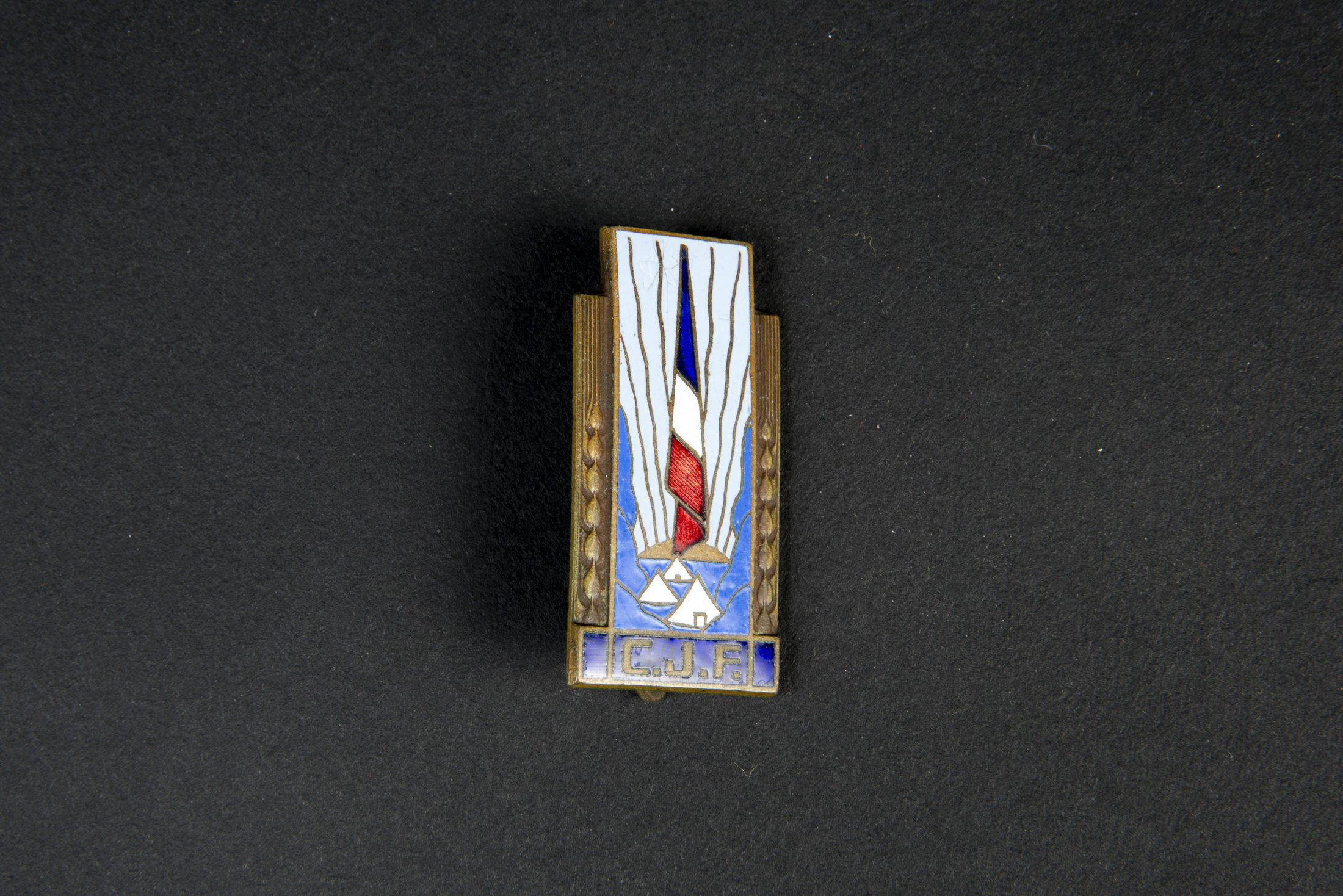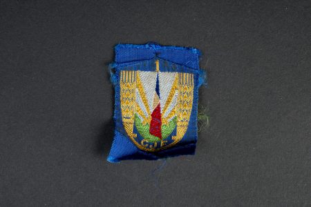 Lot d’insignes du Groupement 1 comprenant une plaque d’identité du jeune Georges Korenbeusse, un insigne en métal doré émaillé de fabrication Decat avec un petit fêlure dans l’émail, un insigne en tissu du groupe 10 du Groupement 1, une barrette de seconde équipe, un insigne de béret en tissu, un insigne général en tissu, un insigne général en métal émaillé de fabrication Drago Béranger, un insigne de boutonnière en aluminium peint des anciens fabriqué par Drago Déposé, un cordon de cape tressé de jeune rouge. Le groupement 1 dit Maréchal Pétain était stationné dans la forêt de Tronçais dans l’Allier. Provenance collection Christian Cournol.