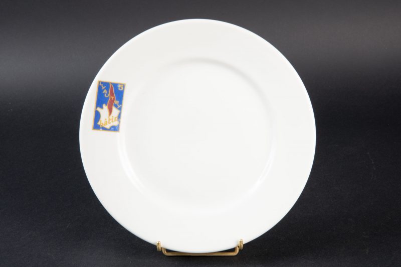 Une assiette souvenirs du Groupement 5, fabriqué par la maison H.T à Limoges et portant l’insigne du Groupement 5. Diamètre 23,5cm. Le groupement 5 Lyautey était basé à Pont-Gibaud dans le Puy-de-Dôme. Provenance collection Christian Cournol.