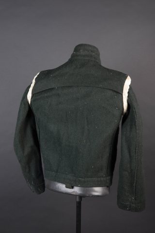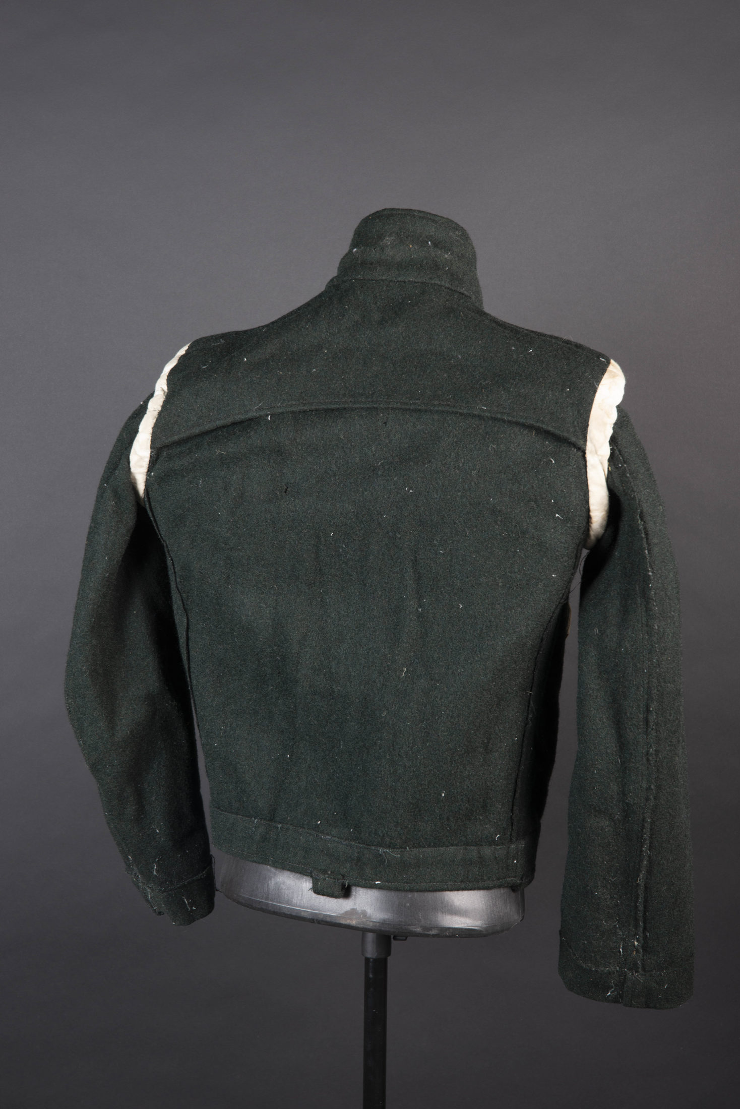 Blouson de jeune des Chantiers premier type, confectionné en drap vert forêt, présence d’un insigne tissus du Groupement 21 cousu sur le haut de la manche gauche, un insigne général en... en savoir plus