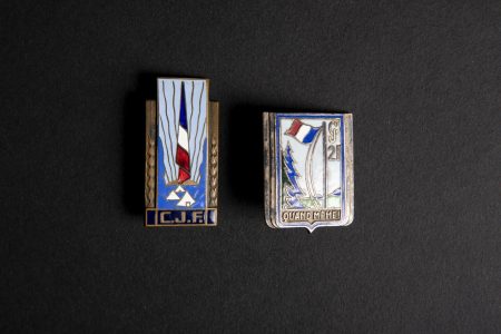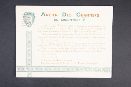 Ensemble d’insignes et de diplômes ayant appartenu au jeune Jalade. Comportant son certificat de moralité et d’aptitude attribué le 12 juin 1942, 5 ordres de missions de l’ADAC, un ordre de déplacement de l’ADAC, une carte postale de l’ADAC du Groupement 21, son insigne en tissus du Groupement 21 cousu sur drap vert, son insigne général en tissus cousu sur drap vert, son insigne général en métal émaillé, sa barrette de Chef d’équipe, son insigne en métal émaillé du Groupement 21 dont les attaches sont ressoudées fabrication Drago Beranger. Son carnet de chants d’environ 45 pages possédant de nombreux dessins. Le groupement 21 dit Gallieni était situé à Renaison (Loire) puis Les Noës (Loire). Provenance collection Christian Cournol.