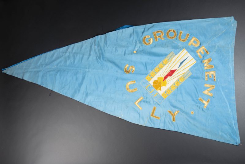 Un guidon des Chantiers, en tissus soyeux bleu, sur une face se trouve brodé le Héron de la Brenne symbole du Groupement 34 surmontant la devise Sursum Corda, sur l’autre face se trouve... en savoir plus