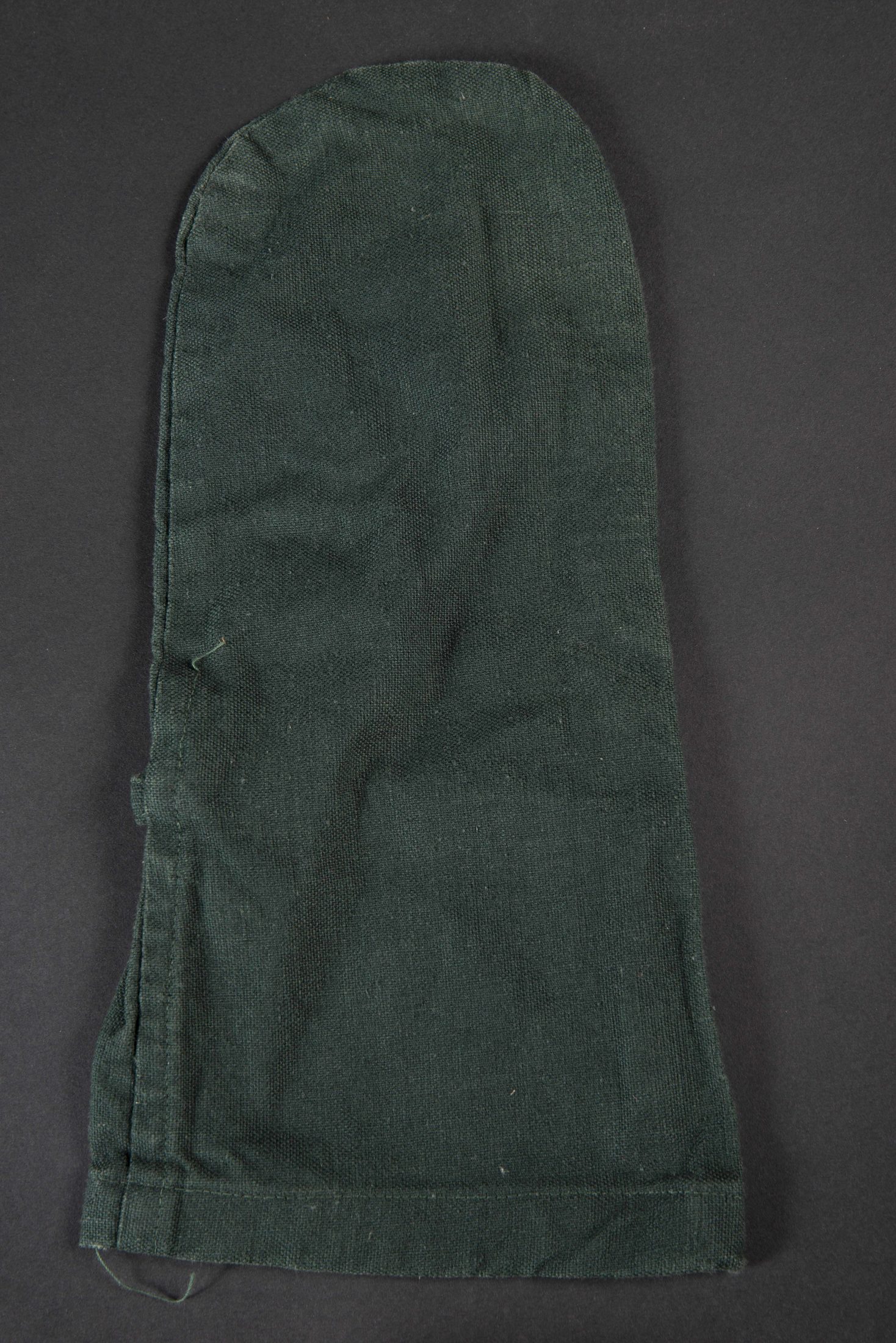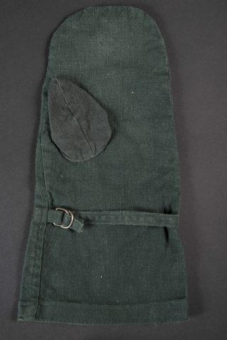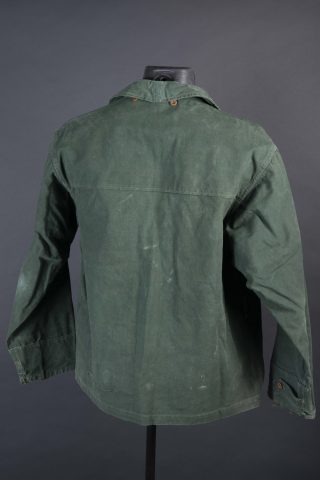 Blouson de ski des Chantiers confectionné en coton teinté vert forêt, passants de ceinture toujours présents, œillets d’aération aux aisselles, boutons métalliques demi sphériques, une patte de serrage en bas de la manche gauche est absente. A noter l’absence d’un bouton à la manche droite. Quelques réparations d’époque, un accro à l’arrière d’environ 13cm. Traces d’usures. On y joint une paire de moufles en toile vert forêt. Le Groupement 39 dit De Foucauld était situé à Montmarault (Allier) puis à Boulouris (Var). Provenance collection Christian Cournol.