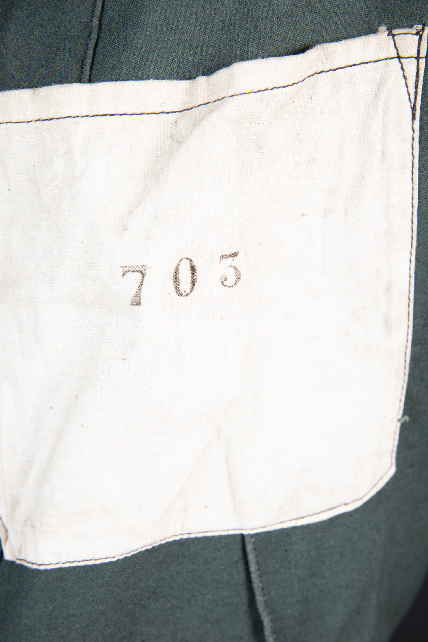 Un blouson de coupe skieur à 2 rangées de boutons, confectionné en toile vert forêt de fabrication tailleur, les boutons de forme demi sphérique se trouvent en peinture kaki d’origine,... en savoir plus
