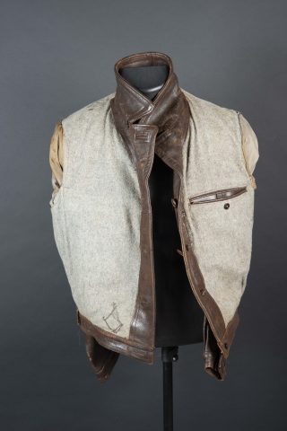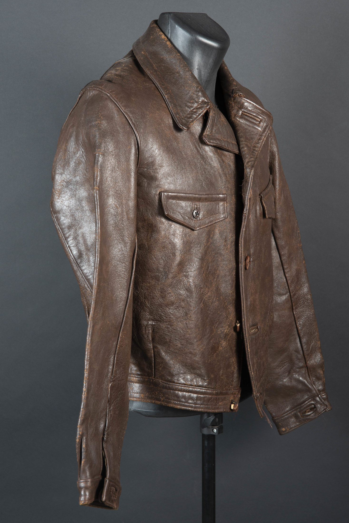 Un Blouson de cuir réglementaire des Chantiers confectionné en cuir havane, 2 boutons sont accidentés et le blouson présente quelques traces d’usures et d’utilisation. Doublure intérieure en laine grise, ouvert aux aisselles. Pièce portée mais cuir souple. Le groupement 18 dit Chevalier-d ‘Assas était situé à Le Vigan (Gard) puis à Maurs (Cantal). Provenance collection Christian Cournol.