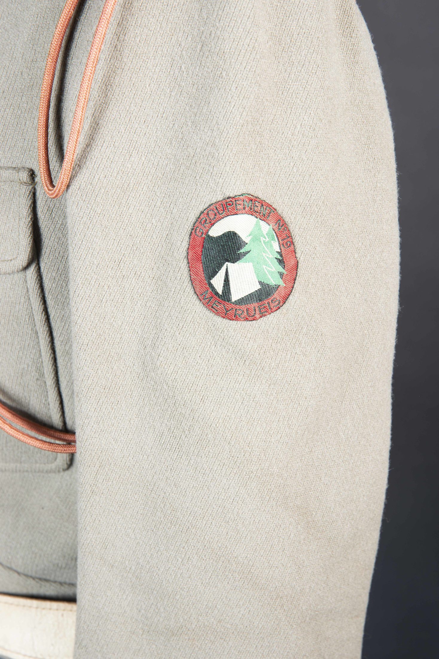 Blouson de cadre réglementaire de couleur grise en tricotine de fabrication tailleur, col en vert forêt, boutons lisse demi sphérique en laiton, un insigne du Groupement 19 cousu sur le haut de... en savoir plus