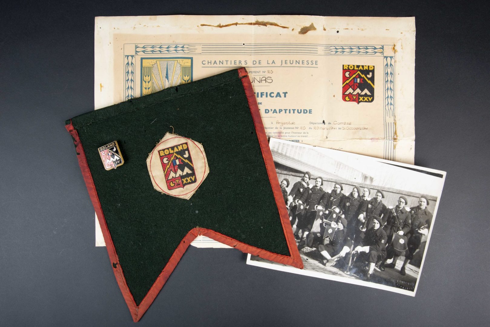 Ensemble de diplôme et Flamme de musique comprenant une flamme artisanale en drap vert forêt avec pourtour en tissus rouge, sur une face est cousu l’insigne du Groupe de direction se trouve également agrafé sur cette face l’insigne du Groupement en métal émaillé sans marquage fabricant a noté un éclat d’émaille sur la zone rouge, flamme possédant de nombreux trous de mites et accros. On y joint une photo de la musique du Groupement 25 ou son visible ce type de flamme, dimensions 23×17,5, joint également un certificat de moralité et d’aptitude attribué au jeune Leyrik Victor portant l’insigne du Groupement en cartouche, certificat plié et portant de nombreuses déchirures. Le Groupement 25 dit Roland était situé à Le Bousquet-d ‘Orb (Hérault) puis à Lunas (Hérault). Provenance collection Christian Cournol.