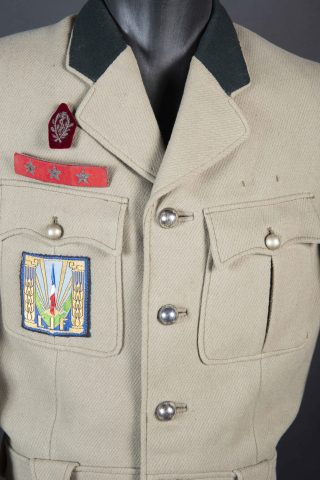 Un blouson de Cadre réglementaire de couleur grise en tricotine de fabrication tailleur et le col vert forêt, avec tous ses boutons argentés demi sphérique, son insigne général en tissu sur... en savoir plus