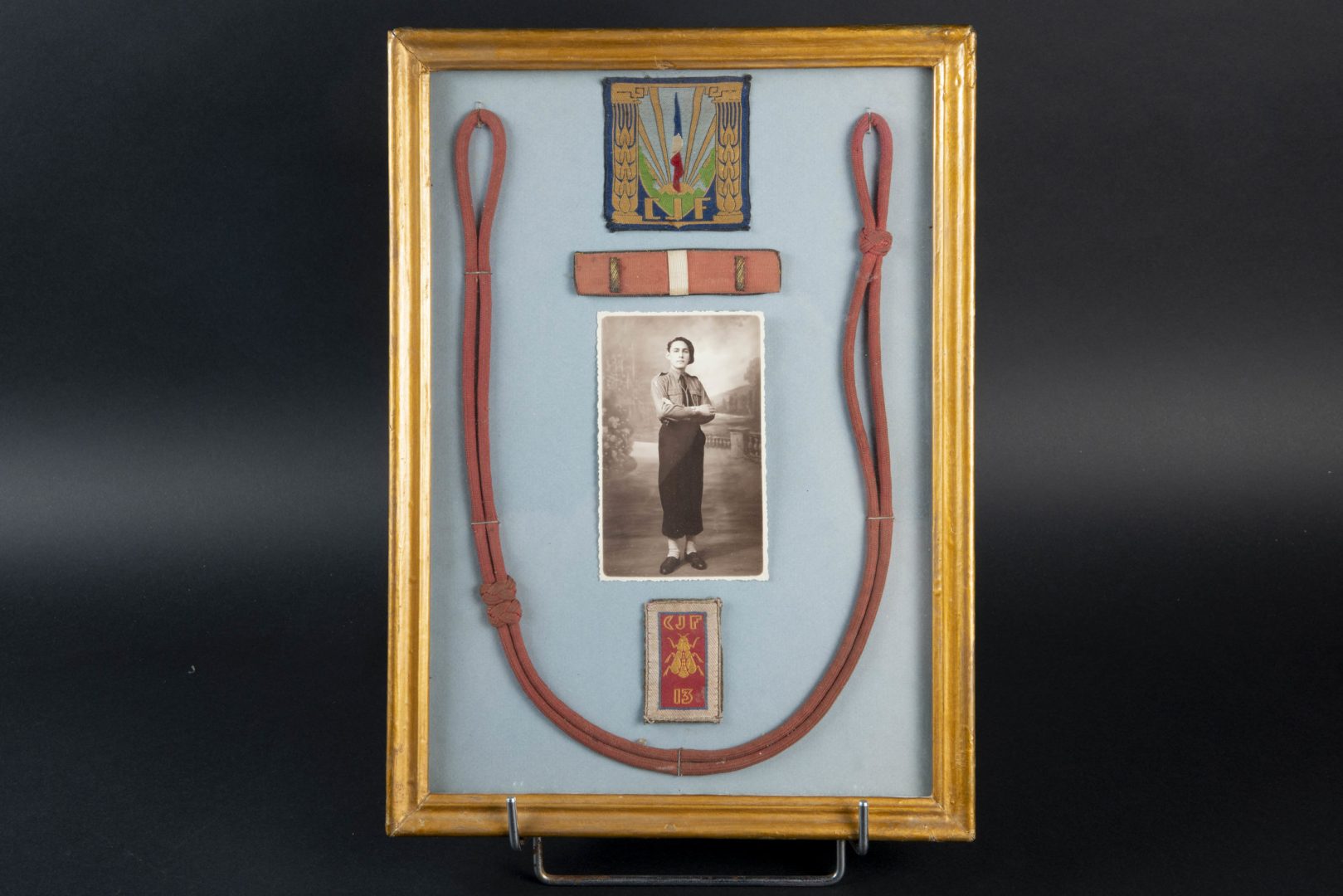 Un cadre souvenirs du Groupement 13 contenant une barrette de Chef d’atelier, un cordon de sifflet de couler rouge, un insigne en tissus du Groupe de direction du Groupement 13, un insigne... en savoir plus