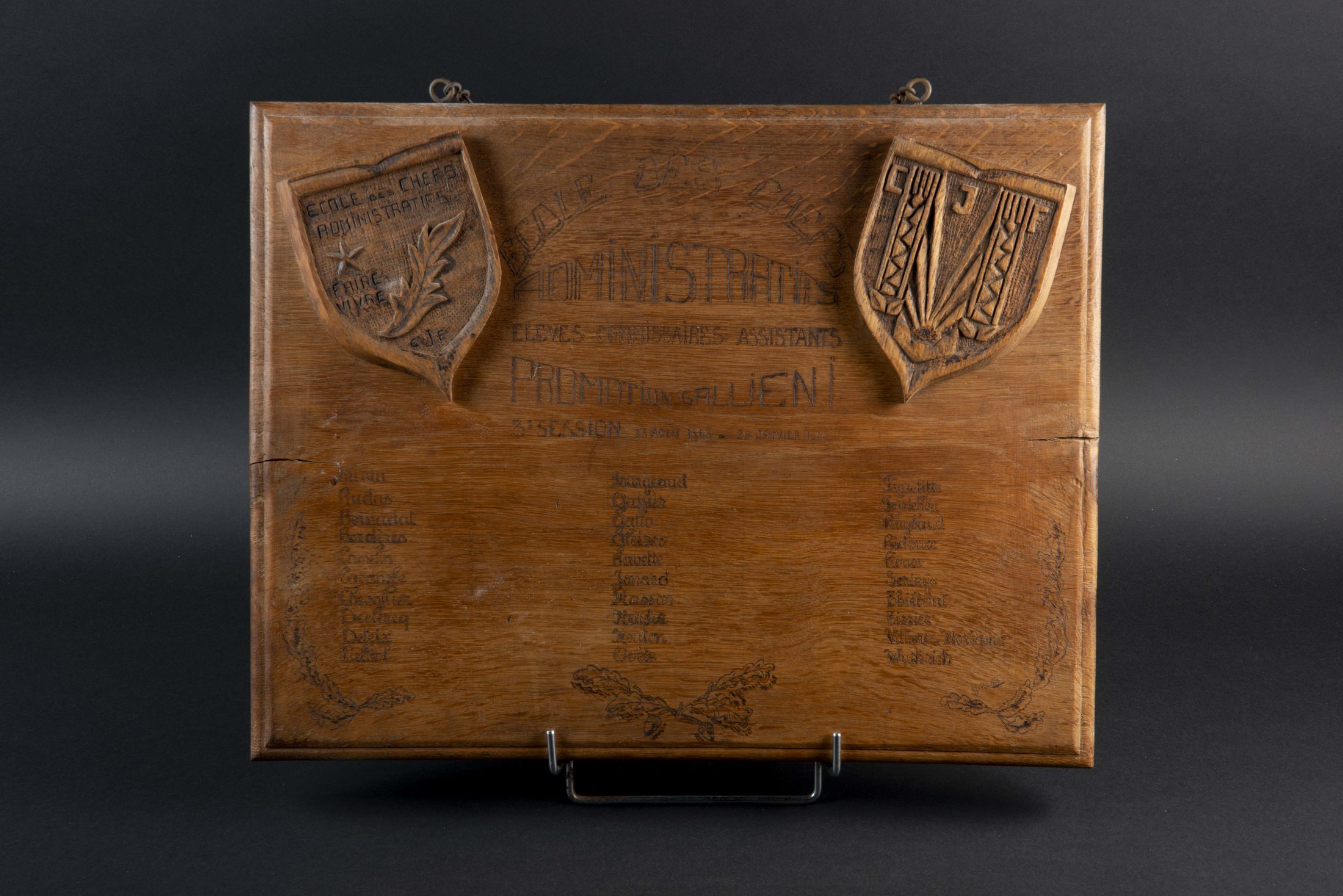 Un panneau en bois de l’école des Chefs administratifs des Chantiers de la jeunesse, des élèves commissaires assistants. Promotion Gallieni 3ème session 28 août 1943 28 janvier 1944. Sur le panneau sont gravés 30 noms des jeunes de la promotion et dans les 2 angles du haut sont représentés l’insigne général CJF ainsi que l’insigne de l’école des Chefs administratifs. Dimensions 50x39cm. Ecole des Chefs des Chantiers de la jeunesse. Provenance collection Christian Cournol.